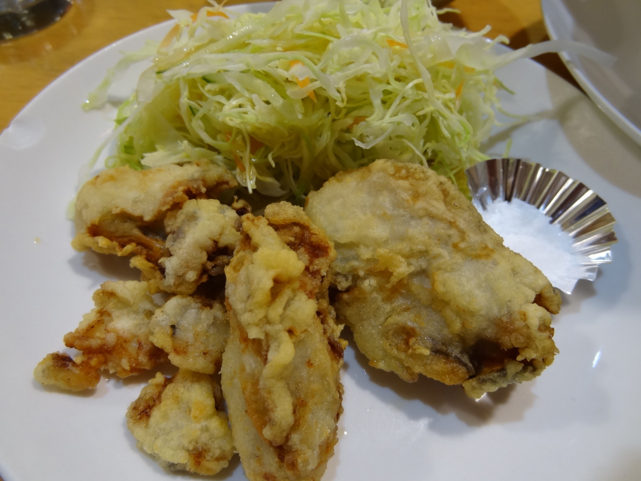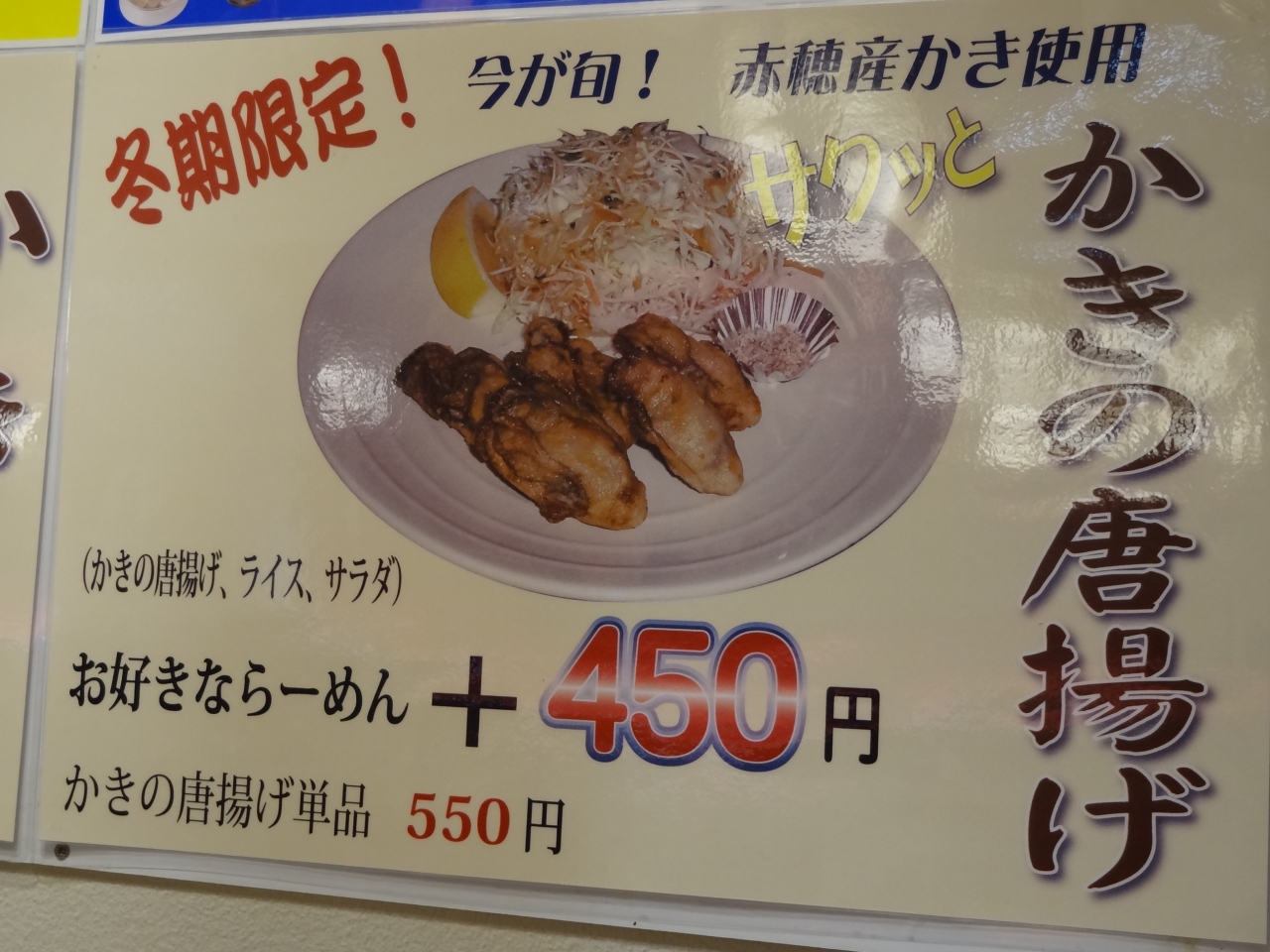 JR播州赤穂駅の二階「プラット赤穂」入り口近くにあるお店です。中国料理が大好きななので、迷わず入店。午後5時少し前でしたので、店内にはお客さんはいませんでした。店内は清潔に掃除されていて、雰囲気は明るい感じがしました。男性の店員さんはしっかりとした対応で接客してくれます。オーダーしたのはかきのから揚げ+お好きならーめん。らーめんは野菜らーめんに。赤穂市ということだけあって、らーめんのスープはあっさりとした塩味。チャーシューは3枚、キャベツ・もやし・人参の野菜がたっぷりと細麺の上に乗っかっています。かきのから揚げは冬季限定というメニューで、かきの味をしっかりと味わえました。から揚げといえばチキン、でもかきのから揚げもなかなかいけます。気軽に財布にもやさしく食べられる中国料理のお店だと思います。