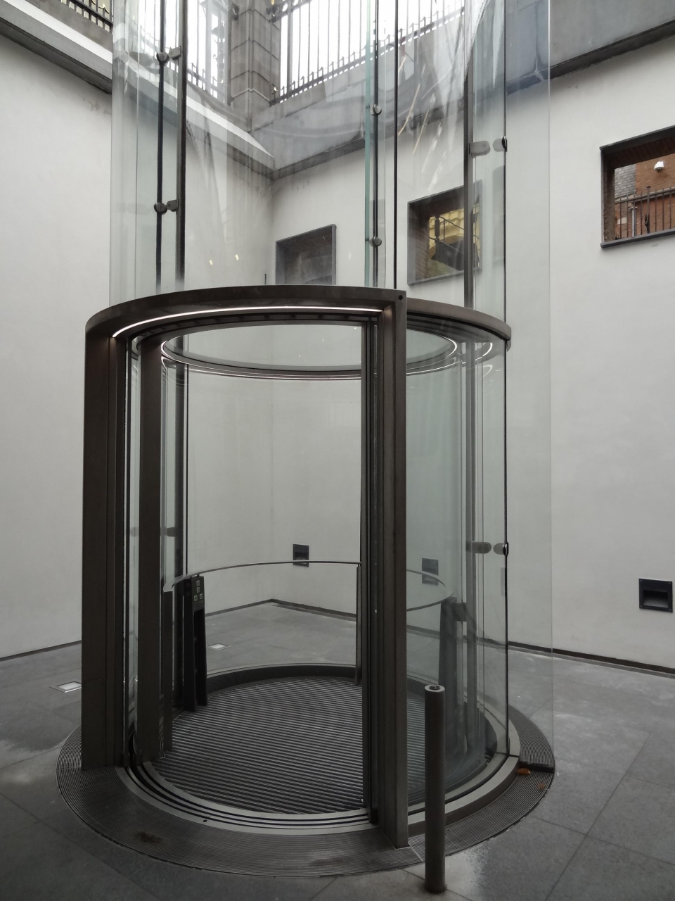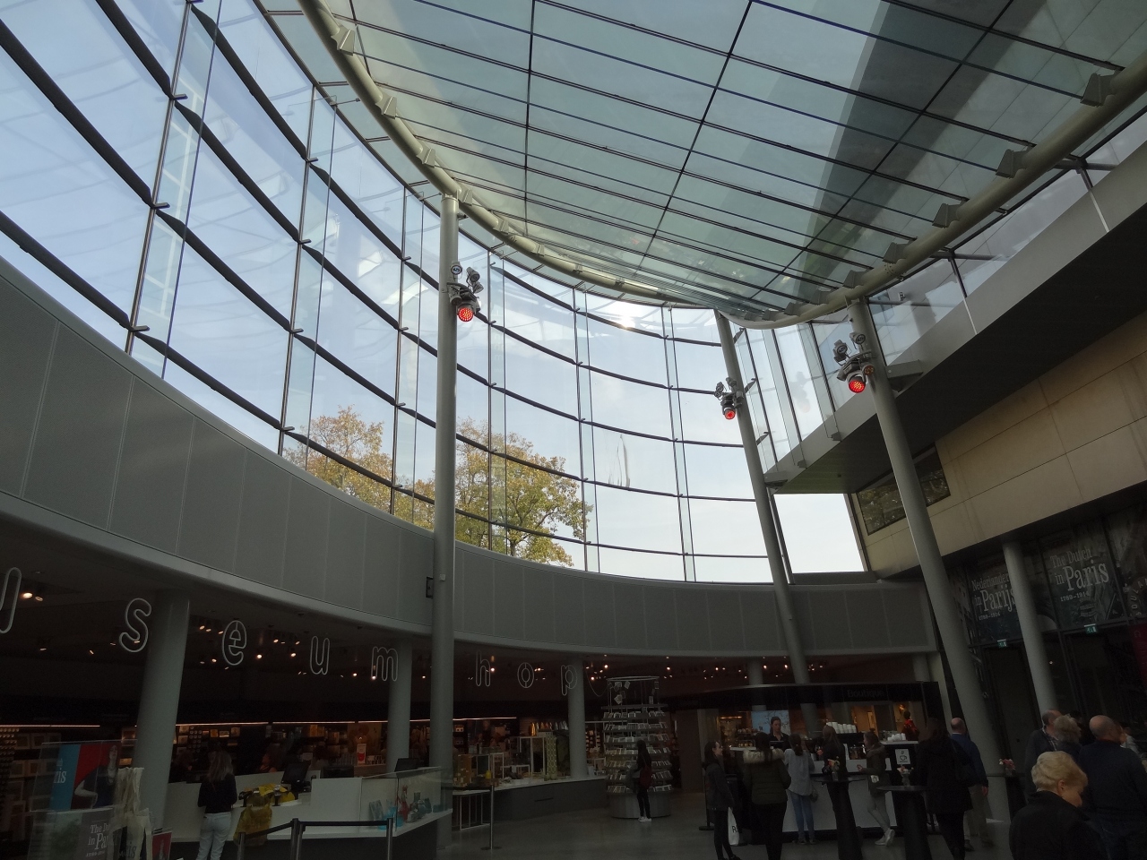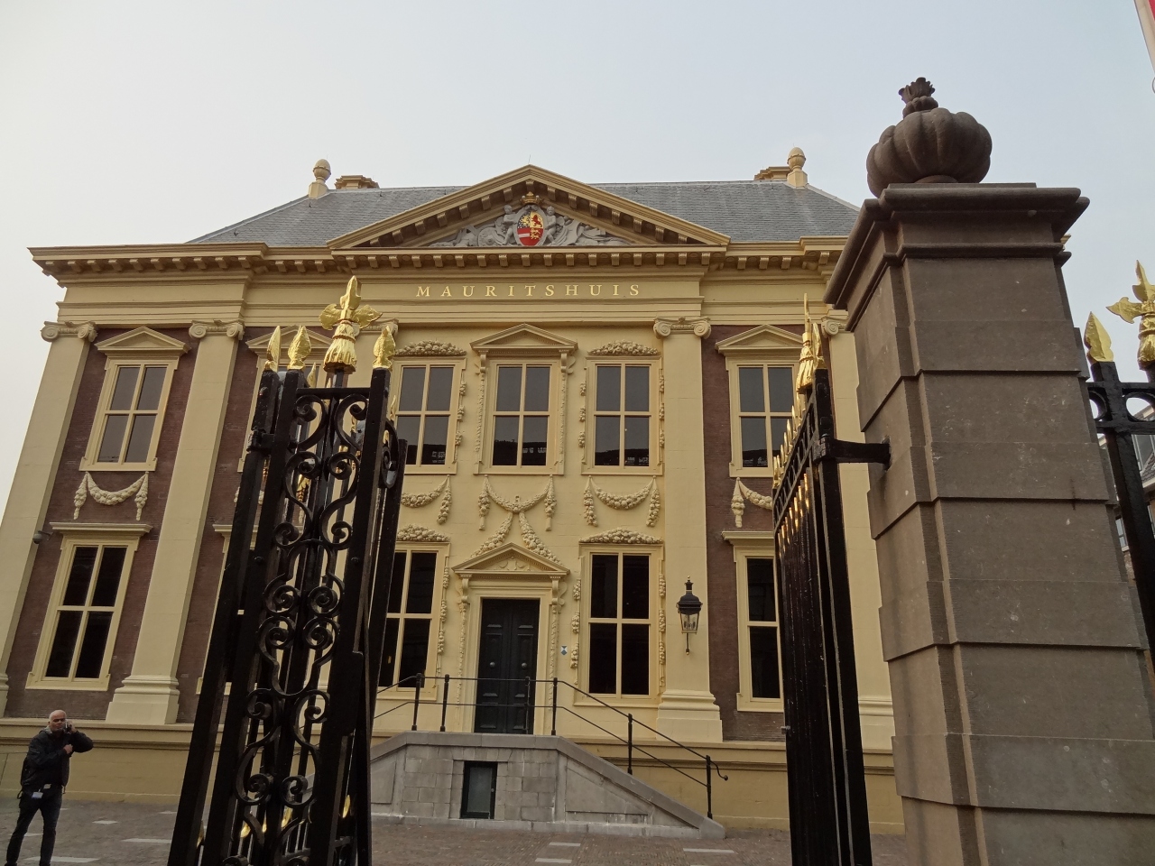 宮殿のような美術館の外には、彫像が一体立つ広場があります。広場から美術館の建物や入り口にある紋章を眺めるのもいいです。館内には日本ではあまり見かけないシースルーの円筒形のエレベーターがあり、外の景色も楽しめます。二階の大広間の壁の至る所に左腕が伸びていて、手にキャンドルを持っています。さらに、上の階にもフェルメールやレンブラントの絵画が展示されています。写真撮影も自由にできます。有名な絵画は何といっても、フェルメールの「真珠の耳飾の少女(青いターバンの少女)」。かなり近くから見られて大満足でした。「デルフトの眺望」という絵にも見入ってしまいました。