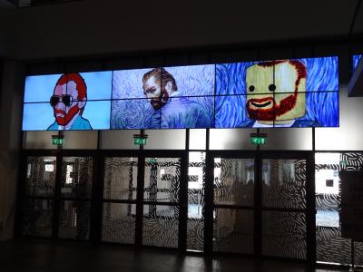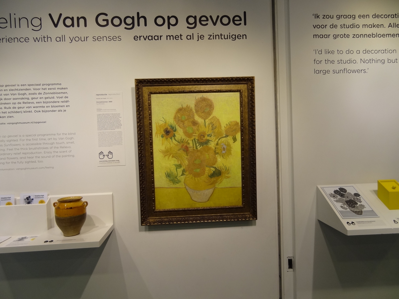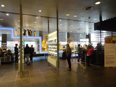 長年の念願がかなってゴッホ美術館に入館しました。美術館の隣にはゴッホの絵に関連したグッズを販売する露店があります。どこへ行っても商魂たくましいと思いました。館内で展示されている作品を撮影することは禁止されています。撮影できない分、しっかり絵画を目に焼き付けるようになりますから、じっくり絵画を観賞できます。本物のひまわりの絵の前では人だかりができていて、さすが人気があります。ひまわりを見ていると、ググッと引き込まれるような感じになるのが不思議です。他にもゴッホの絵画がいっぱい展示されていますから、しっかり見ていくと最低でも一時間はかかります。一階にはお土産ショップが二箇所あります。右側のショップの前にある、複製のひまわりの絵やゴッホの肖像画は撮影できます。ひまわりの絵の横に立って記念写真を撮るのもおススメです。複製のひまわりは直に手で触れることもできます。目の不自由な人にも楽しめるようになっています。二店舗あるお土産ショップでゴッホ関連グッズを見ながら、数点のお土産まで購入してしまいました。