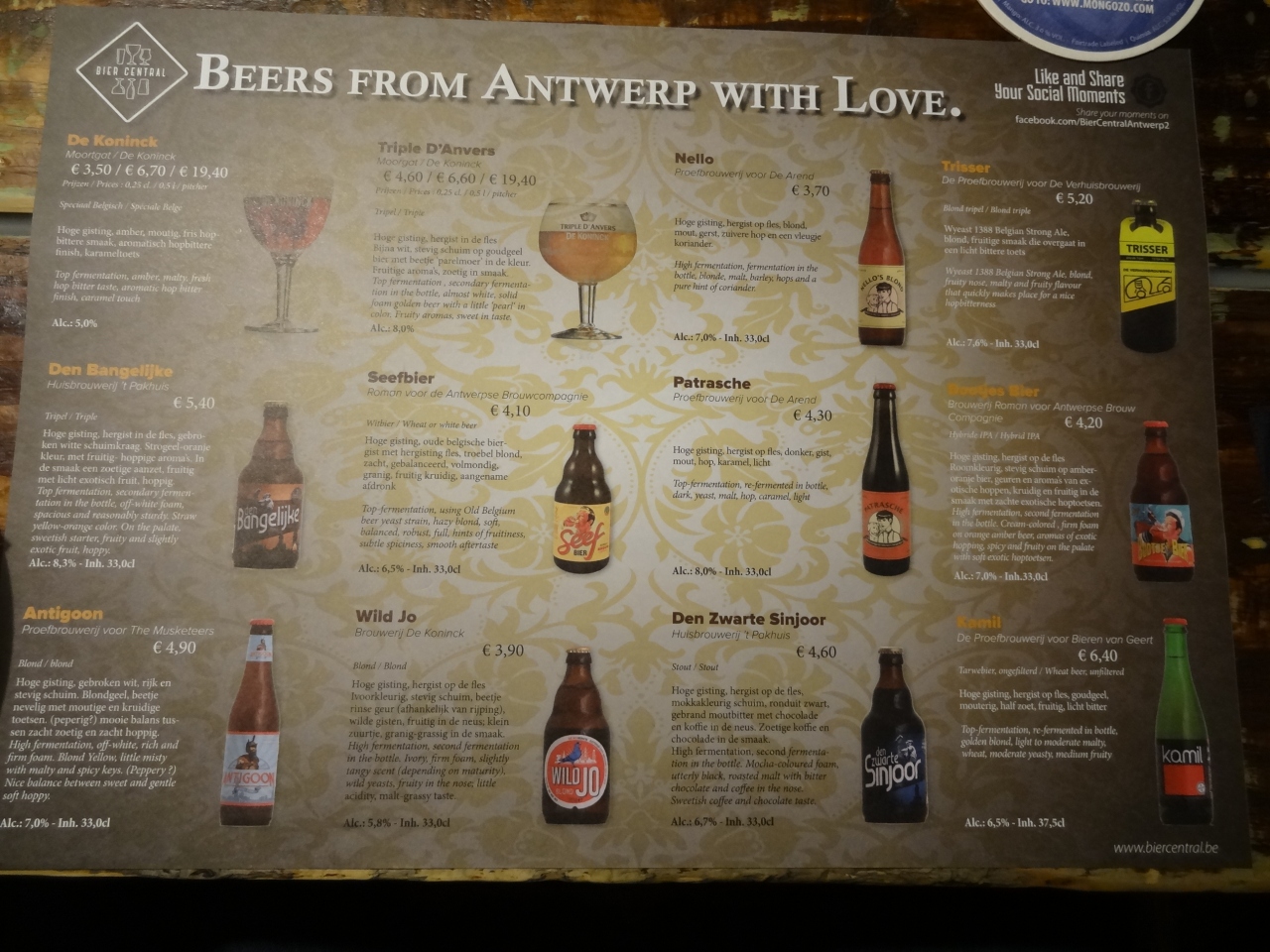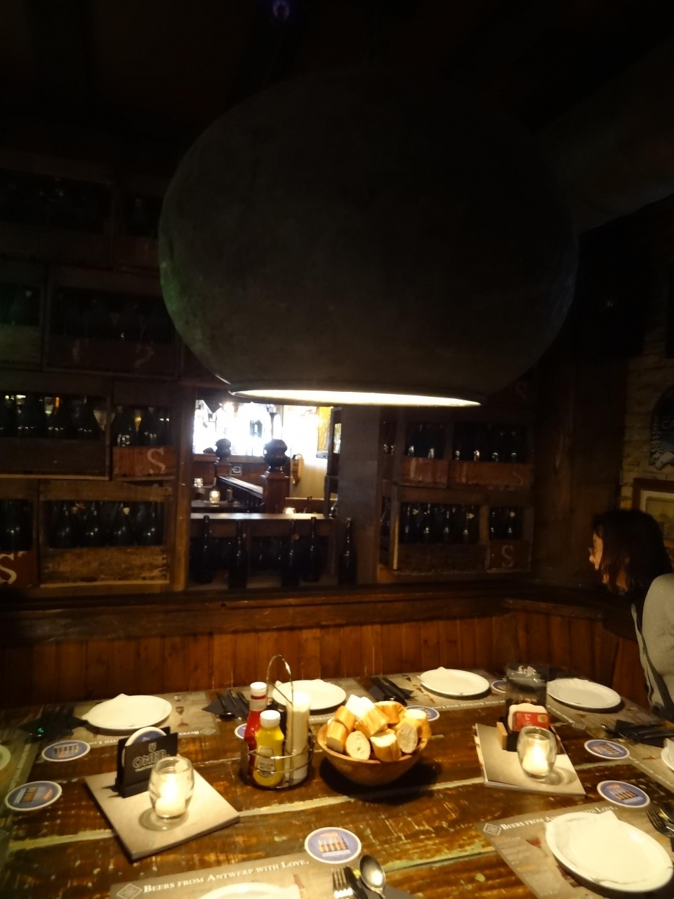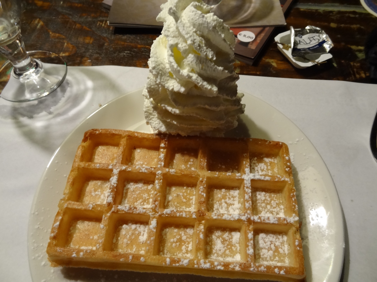 ベルギーのアントワープ市内にあるレストランです。店内は木製のテーブル・椅子で統一されていて、あったかみのあるとてもいい雰囲気です。私たちが座った席の隣には大きな楕円形の樽を横にしてテーブルをはめ込んだ造りにユニークさが感じられました。最初にベルギービールで乾杯。のど越しすっきりの味。さすがベルギービールです。出された料理は野菜煮込みスープと大きなソーセージ、デザートには大きなワッフル。スープはとてもまろやかな味。ソーセージは肉の味を最大限に引き出していて、とても美味しかったです。ワッフルにホイップクリームを乗せて食べてみたら、サクサクと美味しい歯ごたえ。本場のベルギー料理を堪能できて大満足でした。