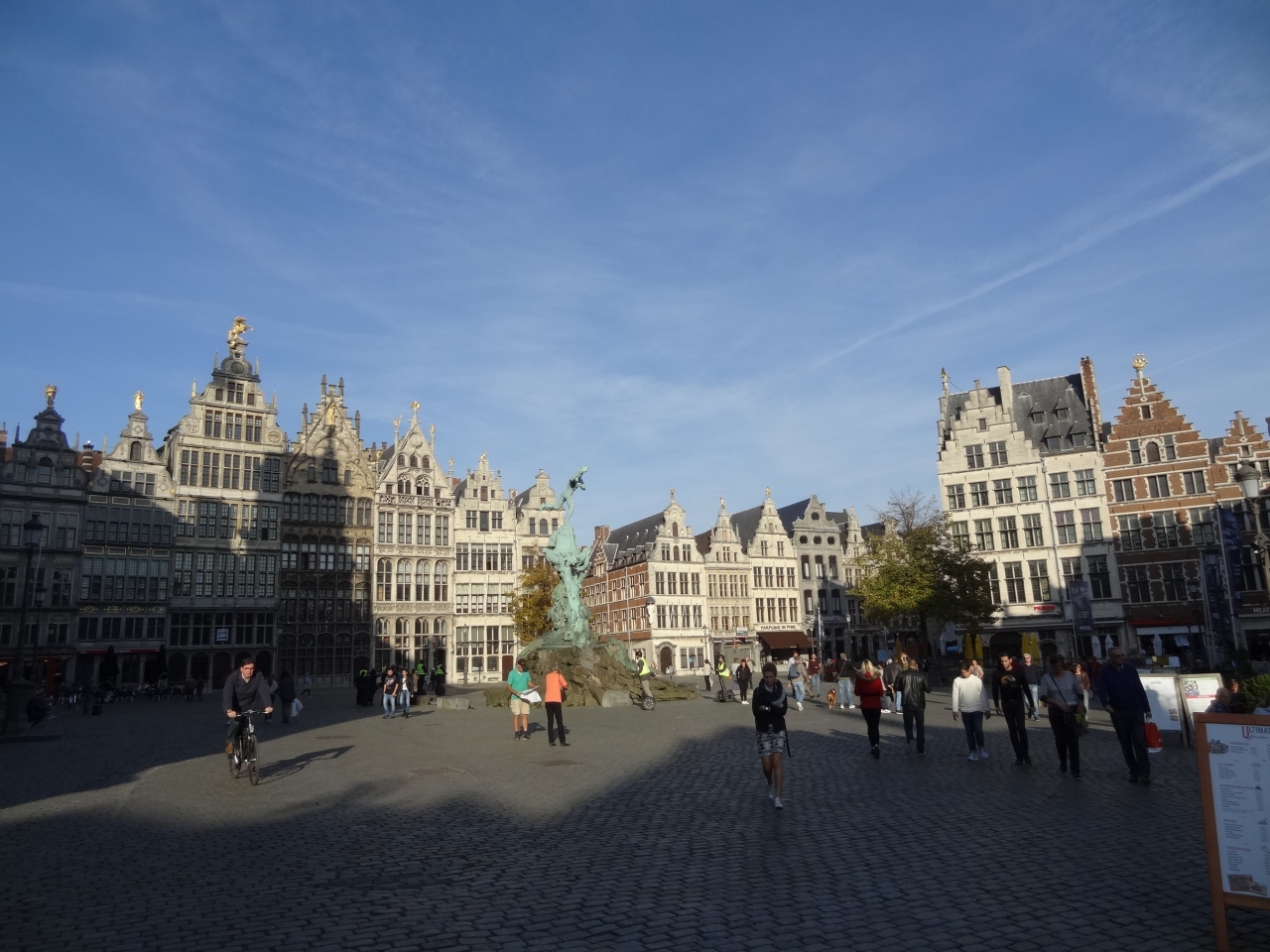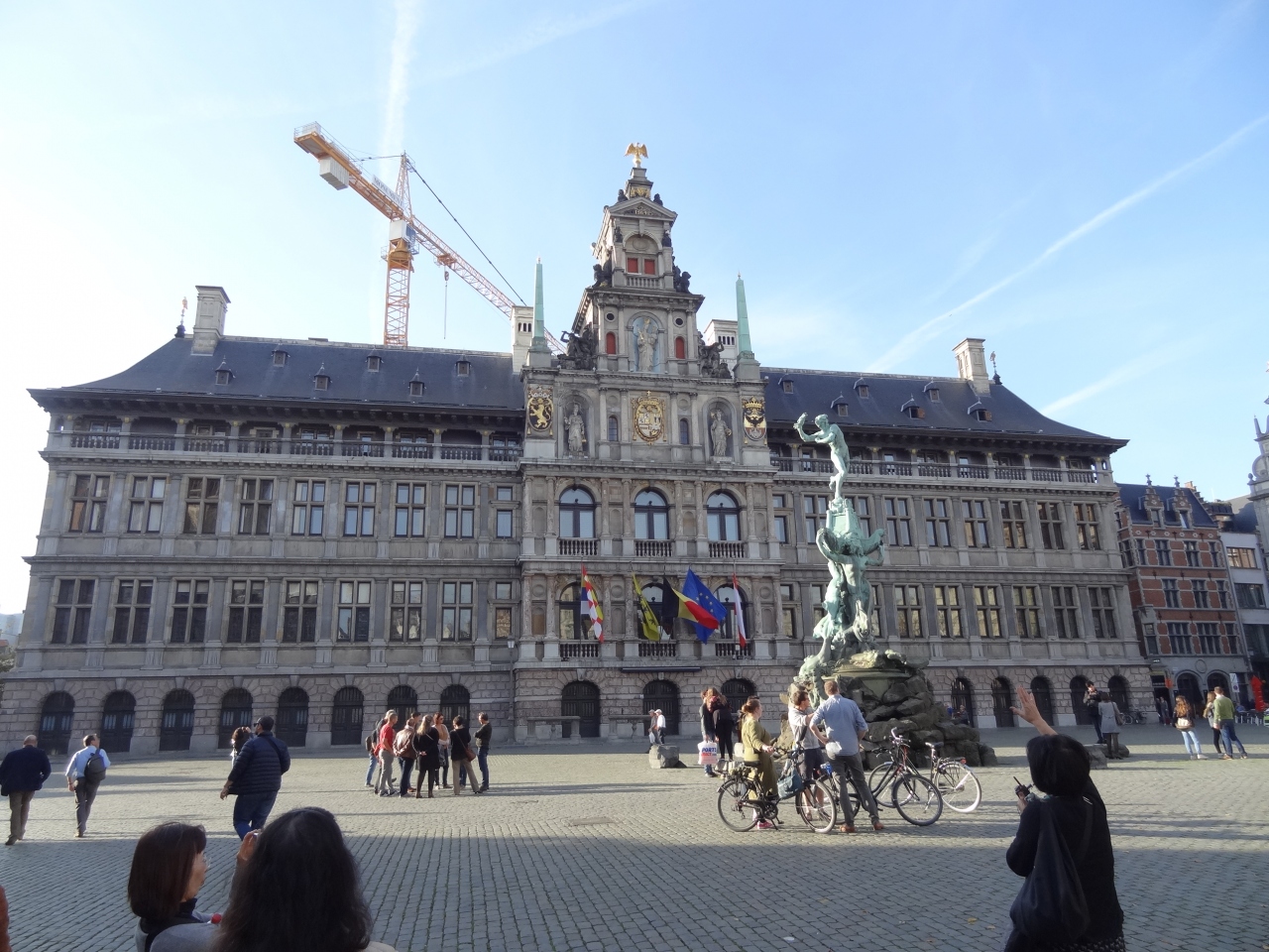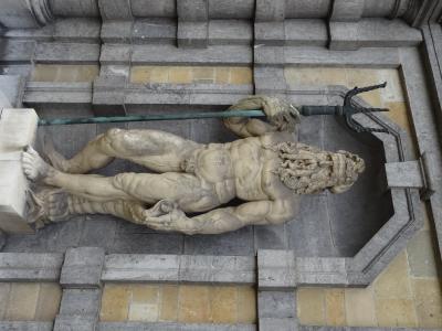 グロート・マルクトの広場にある彫像です。一見するとごく普通の彫像かなと思いますが、よく見ると右手に持っているのが円盤や砲丸でもないです。何とビックリ!大きな手を持っています。なぜ、こんな彫像なのかというと、昔このあたりの河川で通行する人達に対して巨人が通行料を取っていたとか。払わない者には容赦なく手首を切り落として、その手を川の中に放り投げました。それを知った古代ローマ人のシルヴィウス・ブラボーが巨人の手首を切り落として、その手を川に放り投げたとのことです。それからは、このローマ人はベルギーの英雄として崇められ、この広場に彫像として立っているのです。大きな手を放り投げるブラボーの像に「ブラボー!!」。