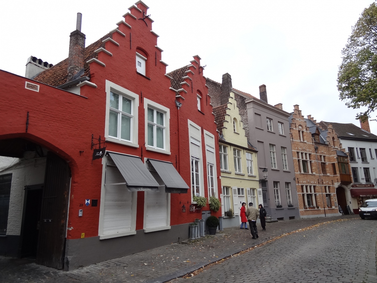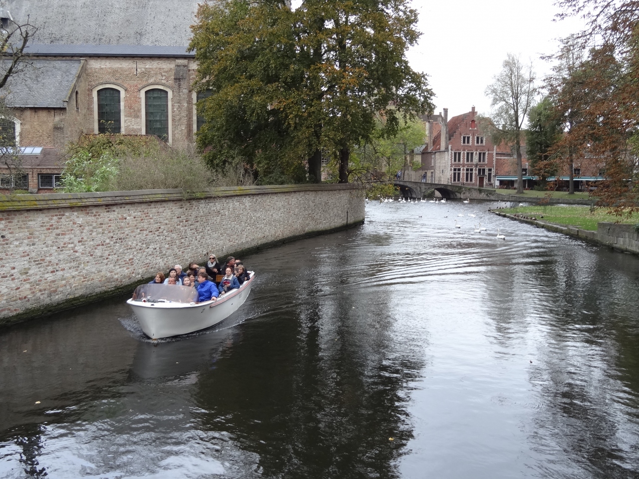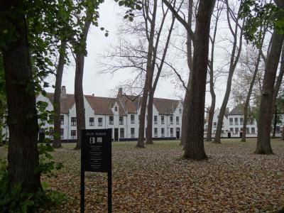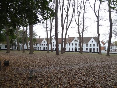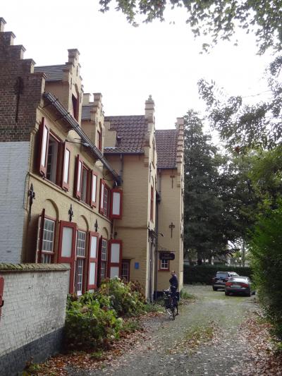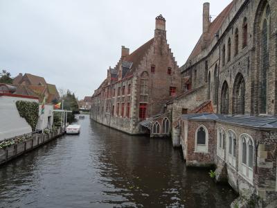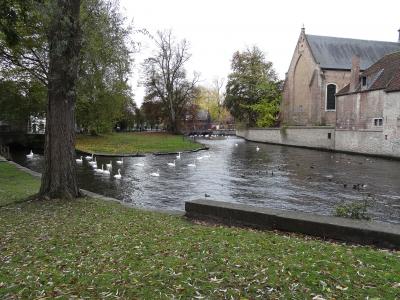 中世の香りが漂うブルージュの広場に建っています。公園の入り口に架かる端を渡って、どんどん歩いていくと中世の時代にタイムスリップしたような感じがします。小さな煙突を持つ茶色の屋根、真っ白い壁が浮き立つ建物がいくつか見え始めると、運河には白鳥が数十匹、観光ボートが行き交って、素晴らしい景色を織り成しています。修道院は数本の樹木の向こう側に見えてきます。修道院も今まで見た建物と同じ色・形をしていて、現地ガイドさんの指摘がないと修道院とは気づかなかったです。お土産ショップやレストランなどが立ち並ぶ小路は散策するだけでも気持ちがウキウキします。おとぎの国から抜け出てきたような可愛いお店ばかりです。ブルージュの町並みはどこを撮影しても写真になるスポットです。