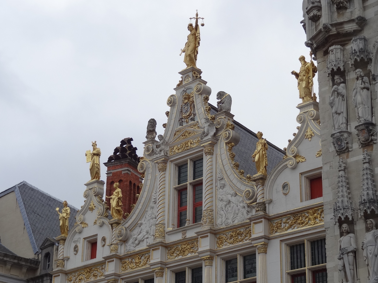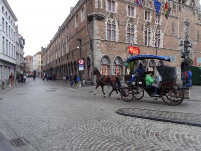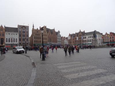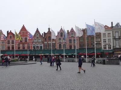ブルージュの街中にある広場。メルヘンチックな建物に囲まれてお土産ショップやレストランも周りにあります。建物には所々黄金に輝く彫像やギザギザに縁取られた屋根、カラフルな色に塗られた壁が印象的です。小雨が降る中、広場の石畳がしっとり濡れ、さらにロマンチックな風情が漂っていました。
