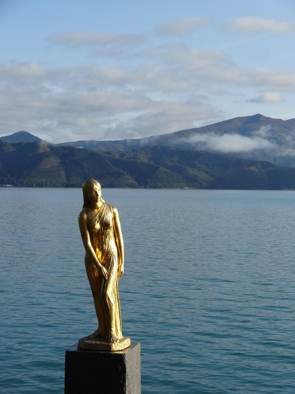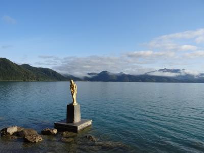 この周辺には駐車場が少ないです。あっても、お土産屋とかホテルの専用駐車場くらいです。仕方なく、祠のある道路脇に停めて、たつこ像の前まで行きました。黄金に輝くたつ子像は道路上から見ると、湖面をバックになります。下まで降りていくと空がバックになります。撮影される方は工夫が必要です。たつ子像を設置された方は、台座と像の高さがどのくらいになるか、湖にどう映えるか思案したことでしょう。
