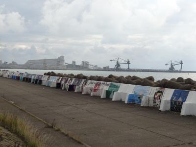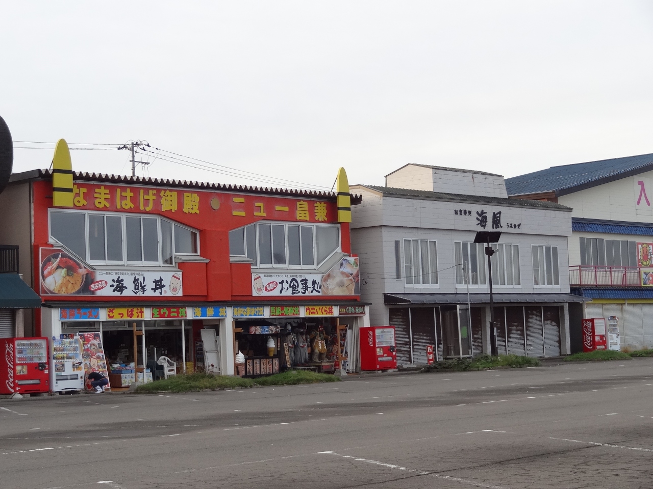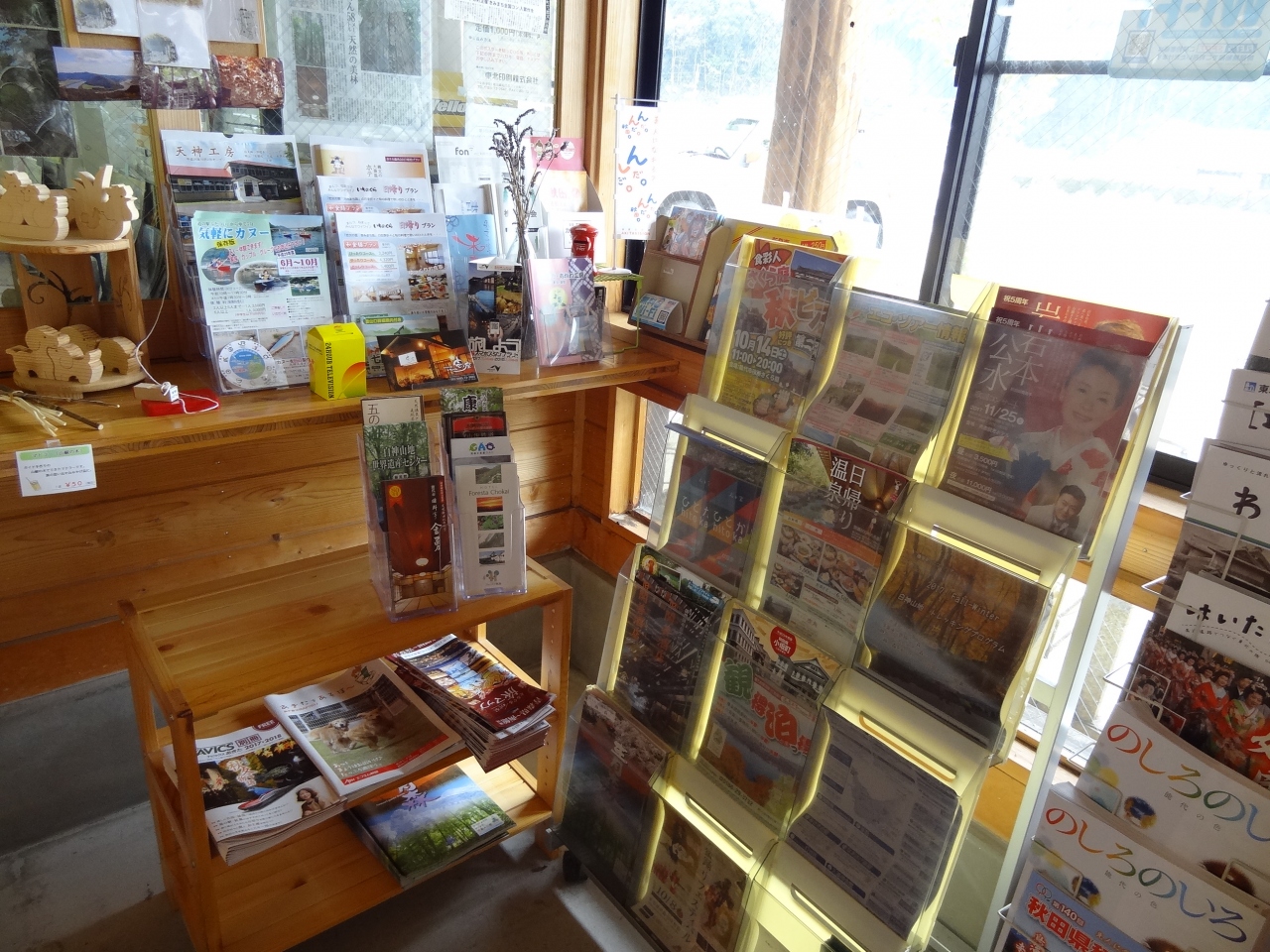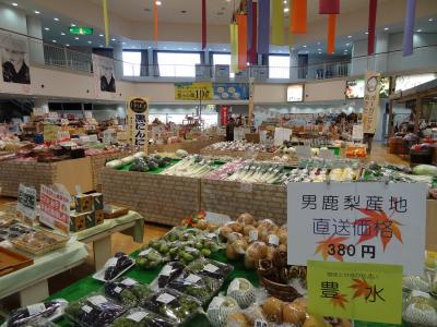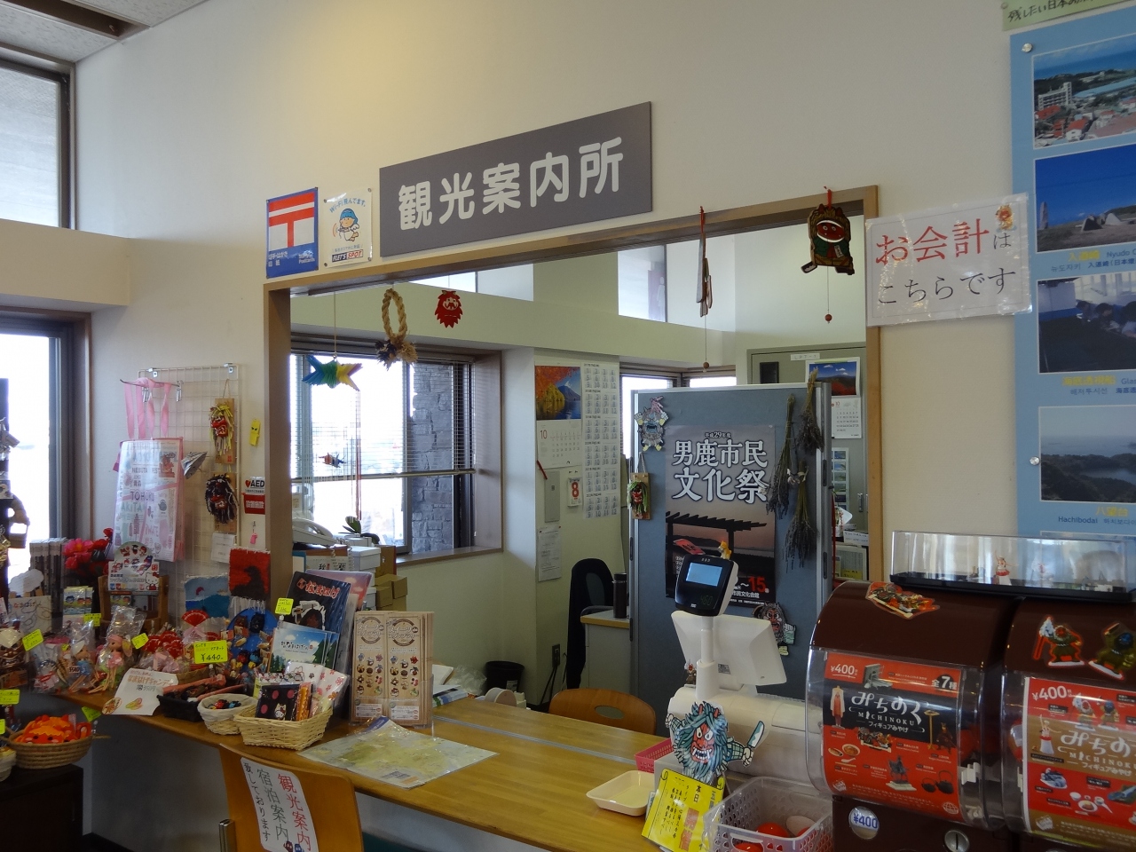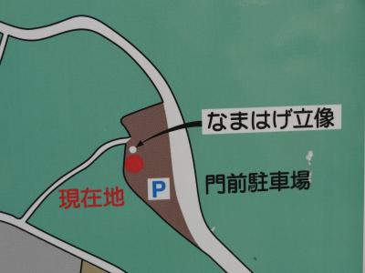 男鹿半島の観光のために車を走らせていたら、何やら前方に巨大な「なまはげ」が二体見えてきました。なまはげに引きつけられて通称「なまはげ案内所」を訪ねました。案内所の前では地元の人たちによるフリーマーケットが行われていて、じっくり品物を眺めちゃいました。観光案内所で男鹿半島のロードマップをゲット。職員の女性にはとても親切に対応してもらい、すごくいい印象を持ちました。