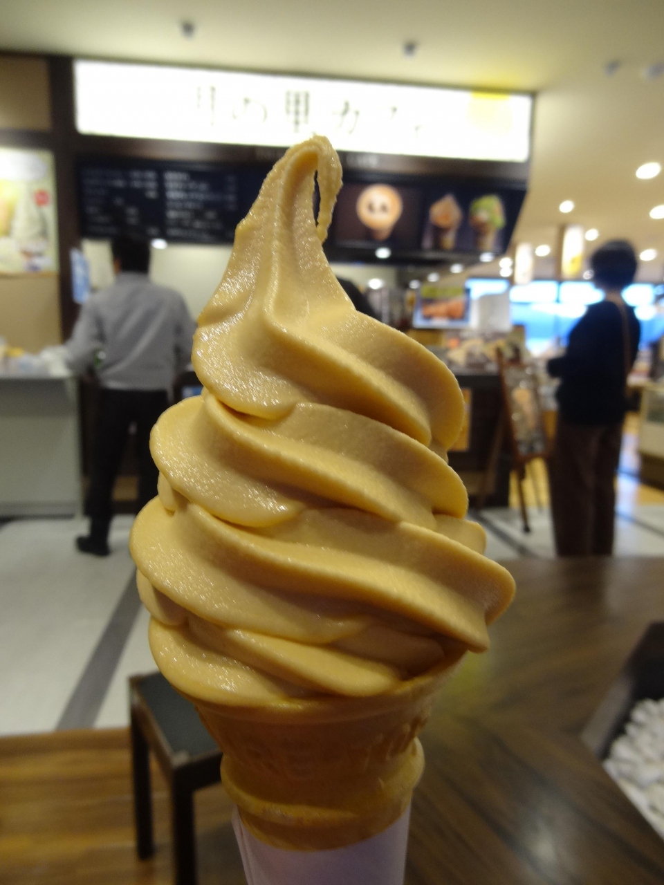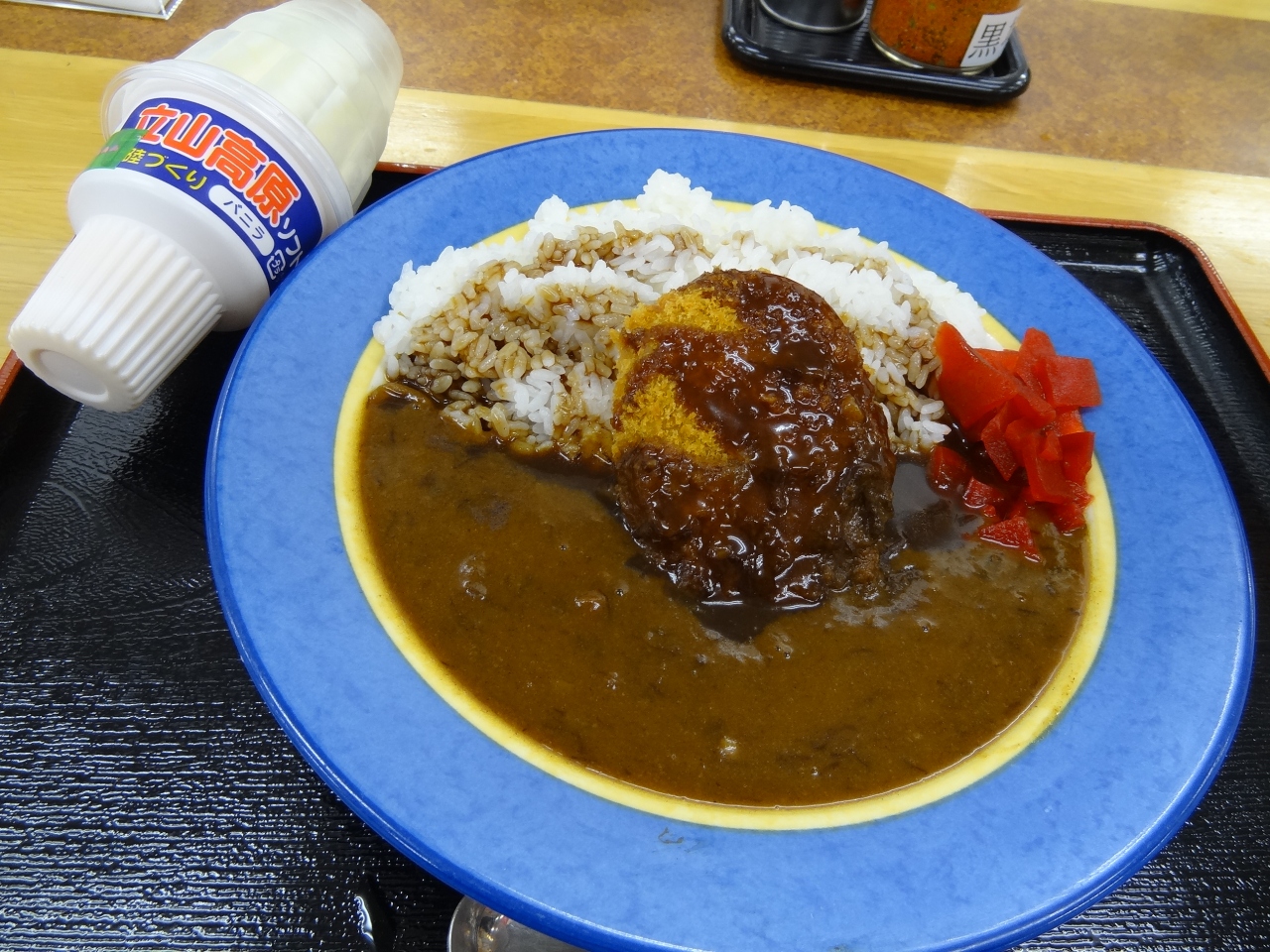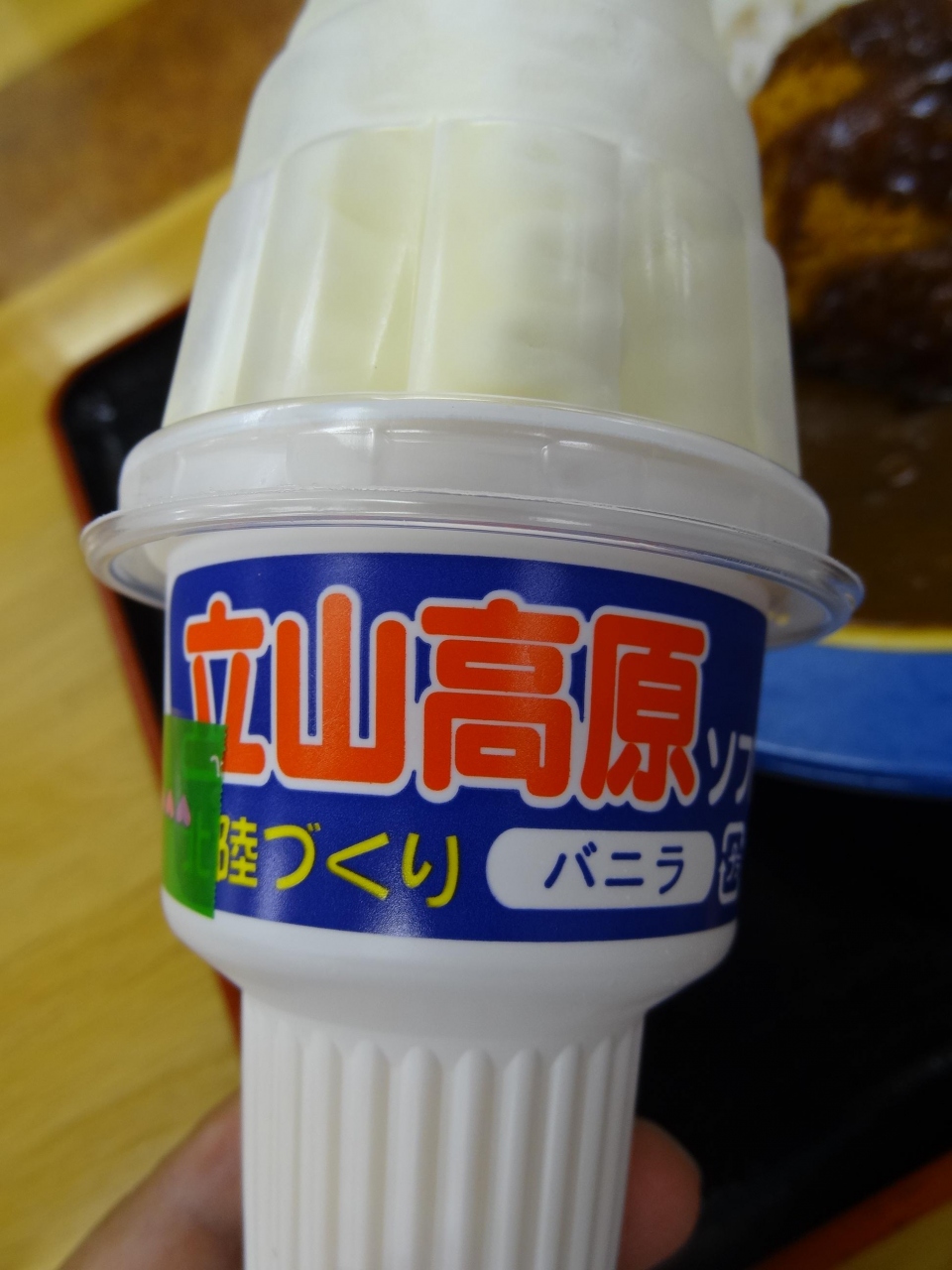 北陸自動車道黒崎PA上り線にある、このお店を初めて利用しました。自販機でコロッケカレーを注文。メニューが出るまでに、チラッと横を見たらソフトクリームのチラシに目が行き、100円ソフトなのですかさず購入。3分ほど待ってメニューができ上がりました。コロッケはカレールーとの相性がとてもよく、カレーはやや辛口でコクがありました。立山高原という名が付いているソフトは味が濃厚なものの、さっぱりとした味わいで美味しかったです。