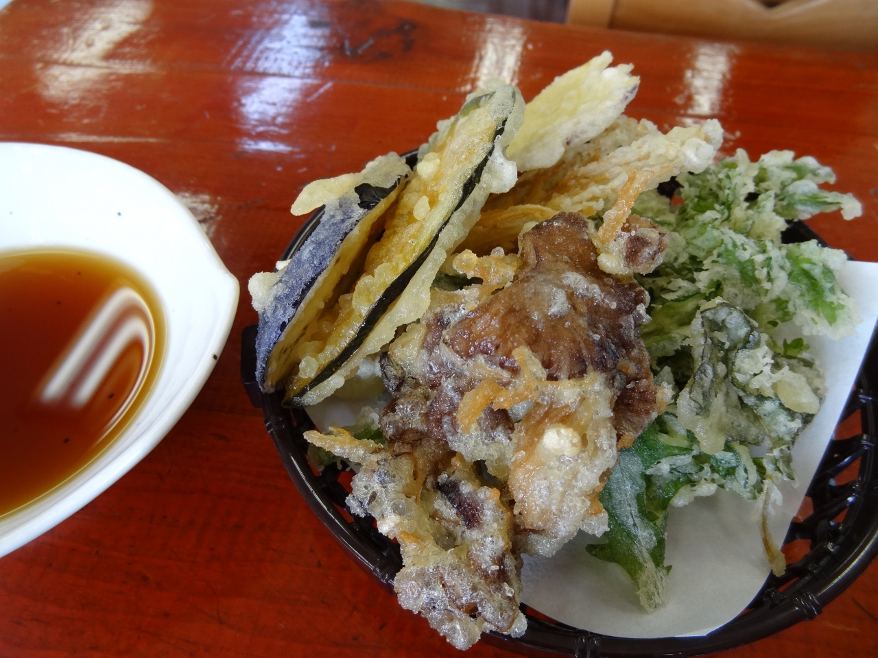 天ぷらは全部で4種類。エビ天とししとうがそれぞれ二本、圧巻なのは大きなマイタケの天ぷらがご飯の上に乗っかっていました。サクサクとした歯ごたえある天ぷらに思わず舌鼓。白味噌のお味噌汁も手作りでシンプルな味に満足。食事中に振り返ると写真と色紙があって、芸能人の田中要次さんもこのお店で食事していたことがわかりました。食事後、お土産コーナーで稲庭うどんなどのお土産をいっぱい買い込んでしまいました。- 旅行時期