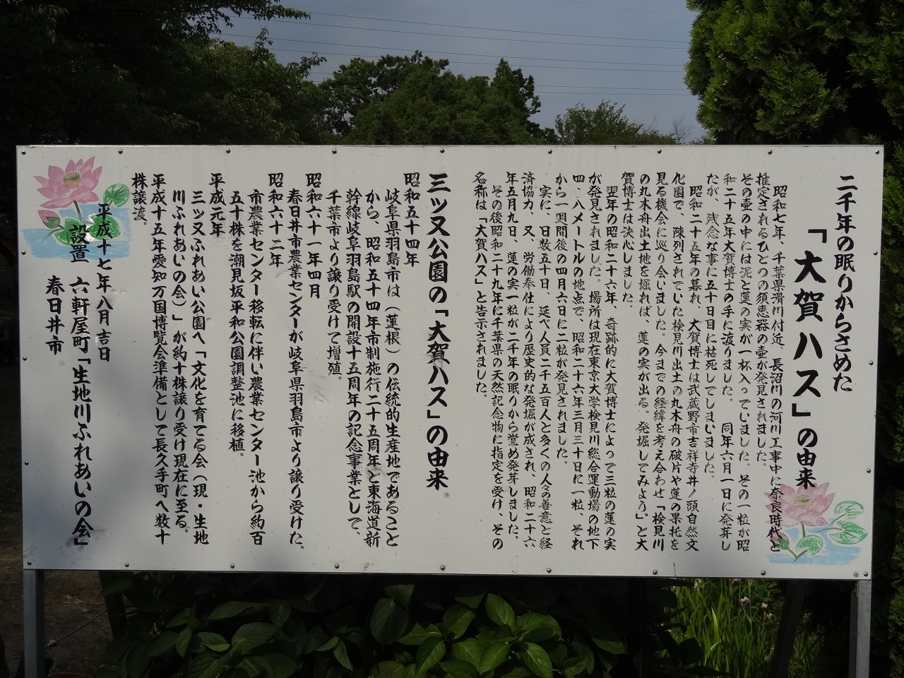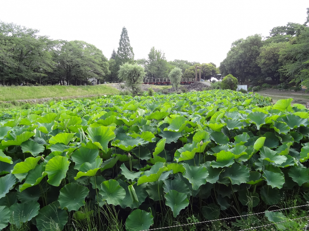 春日井市の福の湯で休憩中に新聞を読んでいて、この公園のハスの花が咲いているとのニュース記事を見て、この公園にやってきました。無料の駐車場があります。6台くらいは駐車できそうです。ハスの花が咲いている場所を見つけるのは難しくなかったです。まだハスの花は3分先くらいで満開もしくは散りはてた花は3本くらいでした。もう5日ほど後なら、最高の状態で観賞できるでしょう。できるだけ、8分咲きのハスの花を見つけて数枚写真を撮影しました。橋を渡って対岸を歩くと不思議な景色が。何と埴輪が50体ほど散策路の周辺に据えてありました。後で、調べたところ、これは「ハニワの道」とのこと。春日井市民の方の手作りだとか。現地で一体一体よく見ると埴輪それぞれがユーモラスな表情をしていて見ていても飽きません。公園にこういうオブジェを作っているとはとてもユニークだと思いました。