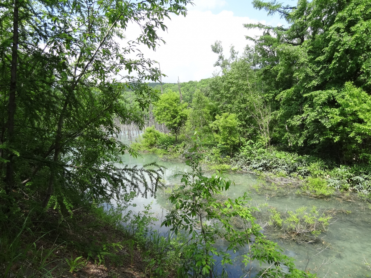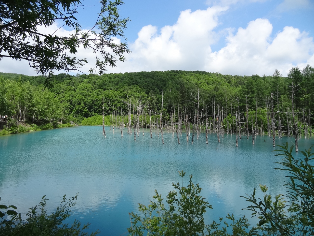 バス専用の駐車場から青い池まで5分くらい未舗装の車道の脇を歩きます。くるまの往来には気を付けなければならないです。散策路に入ると右手に池のようなものが木立の間から見え隠れします。さらに進むと、本当に青い池が出現!立ち枯れした木々がいっぱい青い水面からすっくと立っていて、そのさまは上高地の大正池をおもわせるようです。あるいは裏磐梯の五色沼のような神秘的な青さを彷彿とさせているかのよう。しばらく見とれてしまいます。なぜ、何の飾りもない名前になってしまったんだろう、と不思議でなりません。