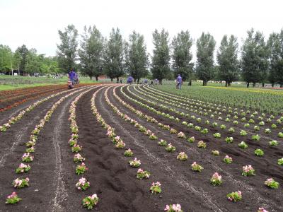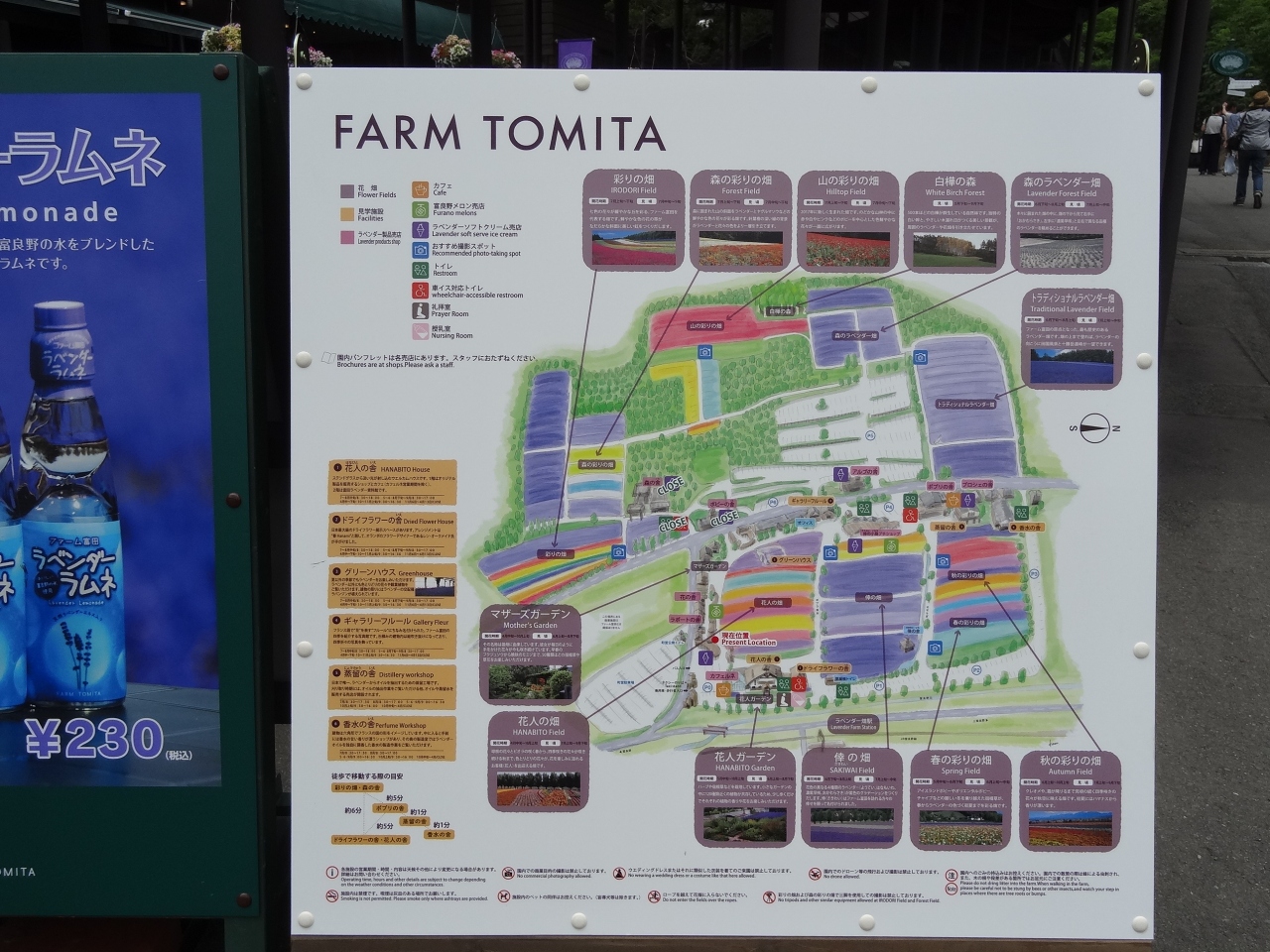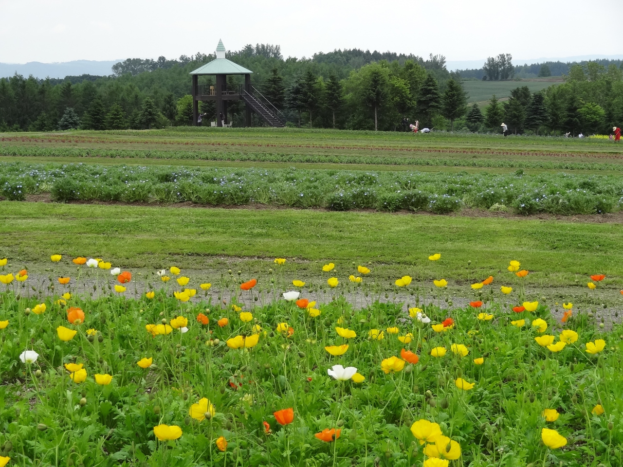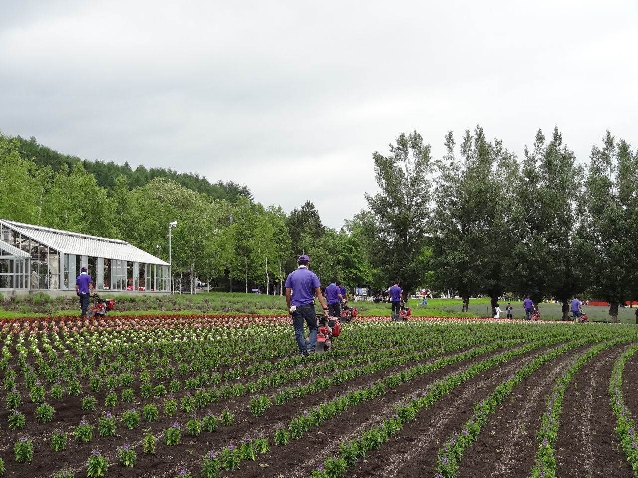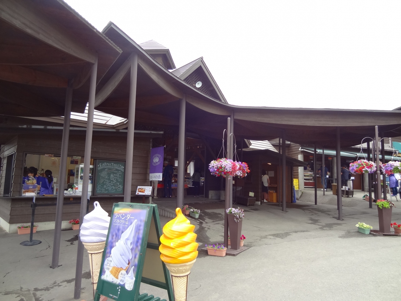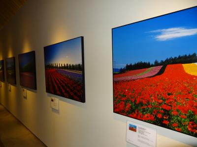 駐車場から右手にお花畑が見えて、緩い坂の右側には土産や食事処の店が並んでいます。散策路を歩きながら、お花畑を見ていると色とりどりの花が咲き誇っている畑が続きます。一部の畑では、ミニ耕運機で耕す職員の姿が見られました。ラベンダーの工場もあって、大きな貯蔵容器も見られます。富良野・美瑛の見事な風景写真が展示されているので、写真に興味がある方は必見です。