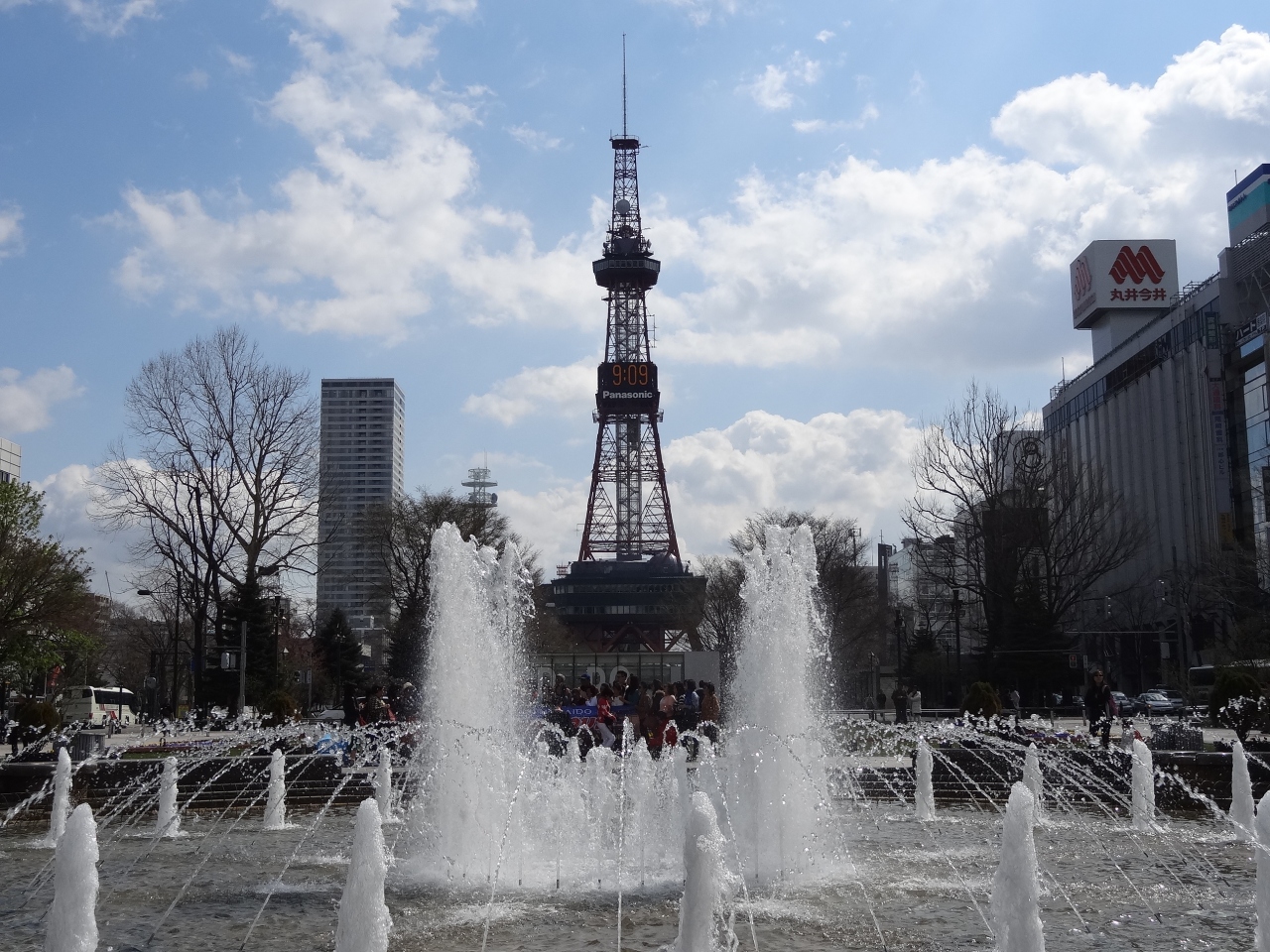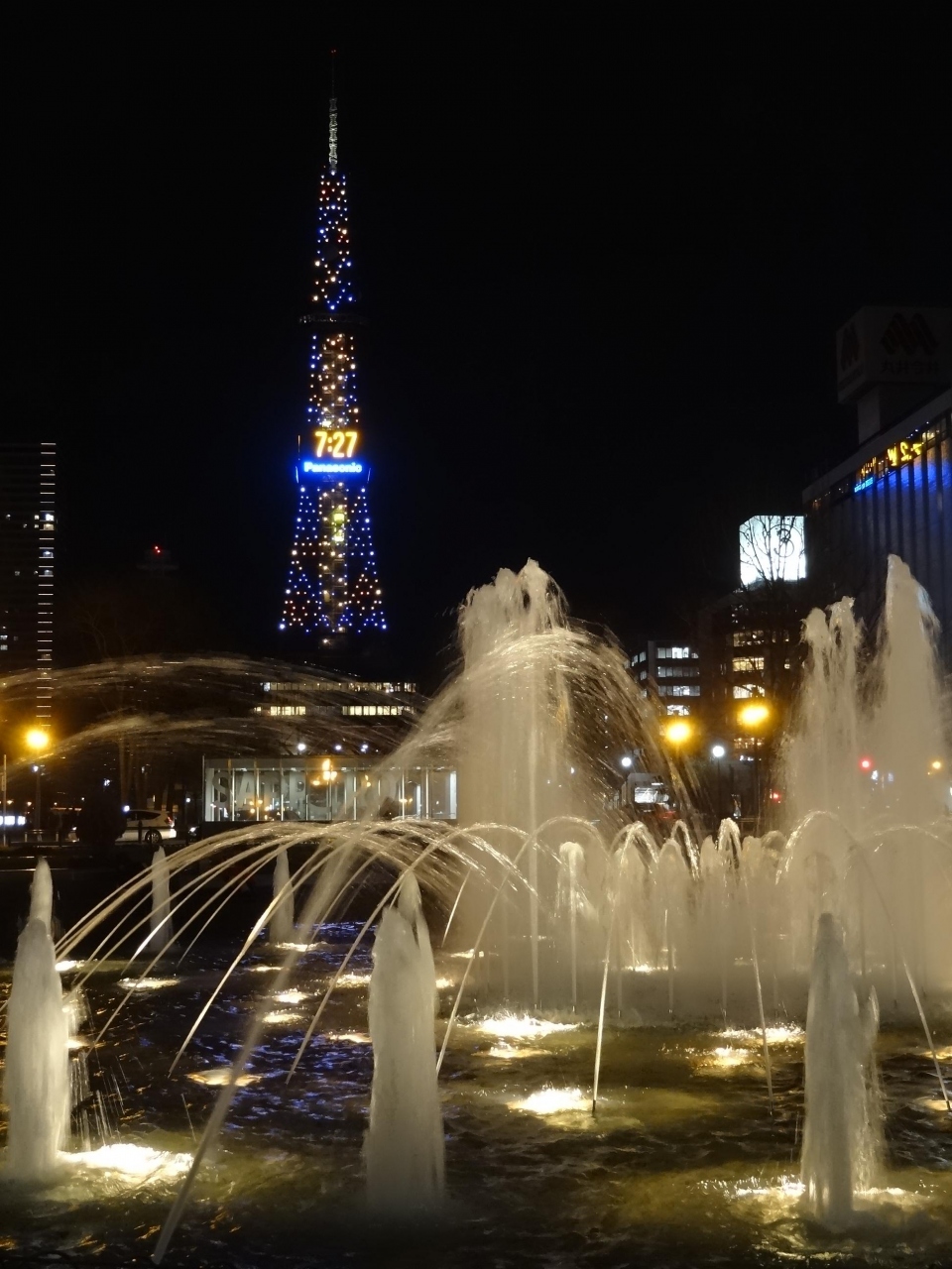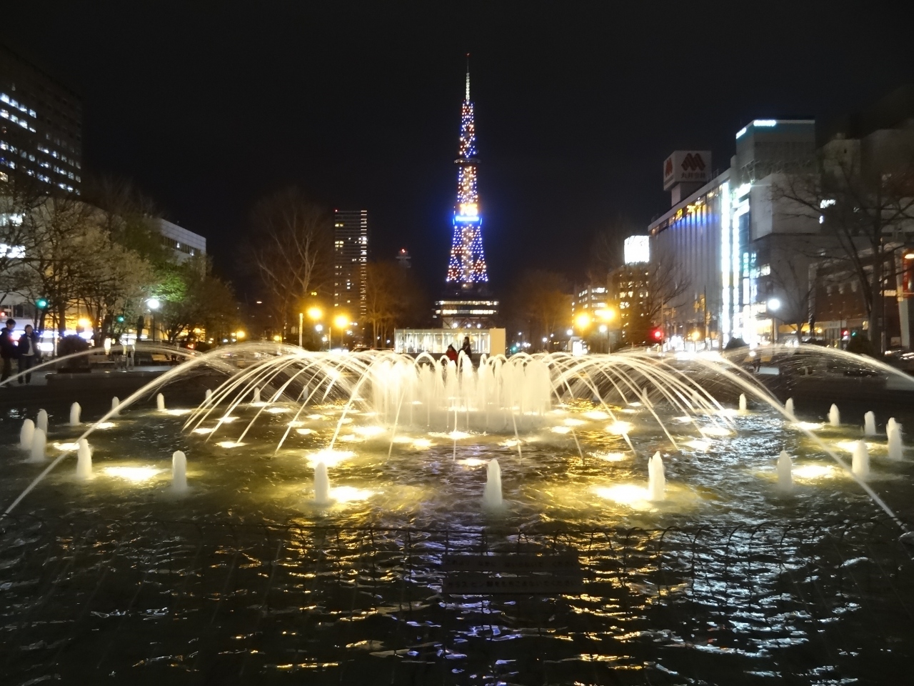 北海道旅行の最終の夜に大通公園を訪れました。以前にも何度か訪れたことはありますが、いずれも昼間ばかりで今回のように夜のライトアップされたタワーと噴水を見るのは初めてです。タワーの電飾の色がいろいろと変わり、噴水の水の形も変化するので、いい組み合わせになるのを待って撮影すると、とても幻想的な風景になります。朝方の写真も