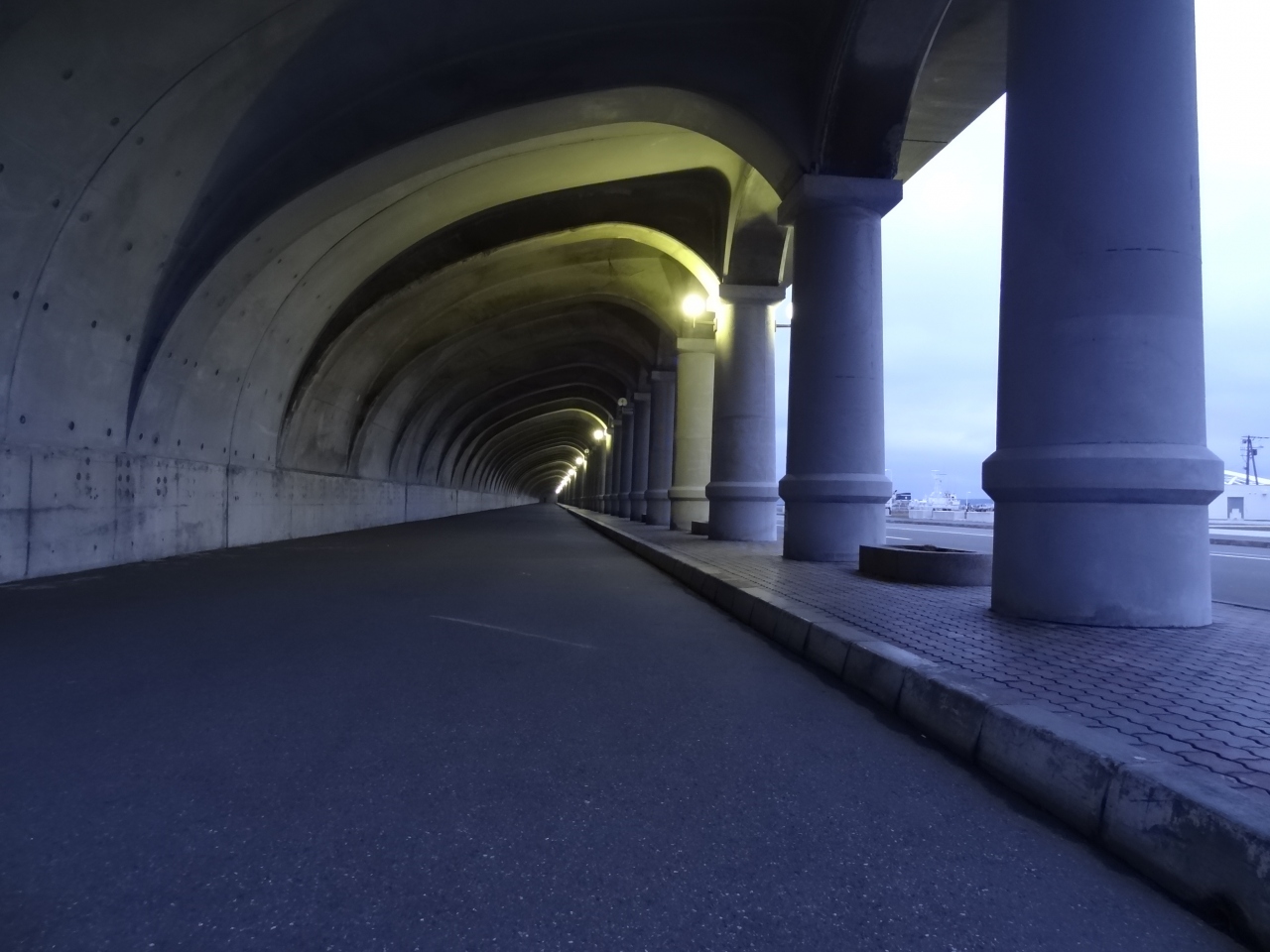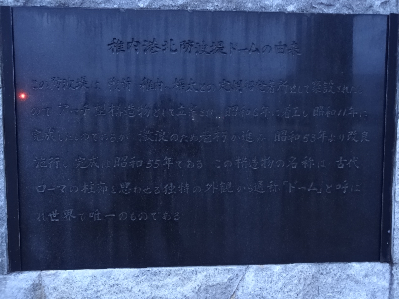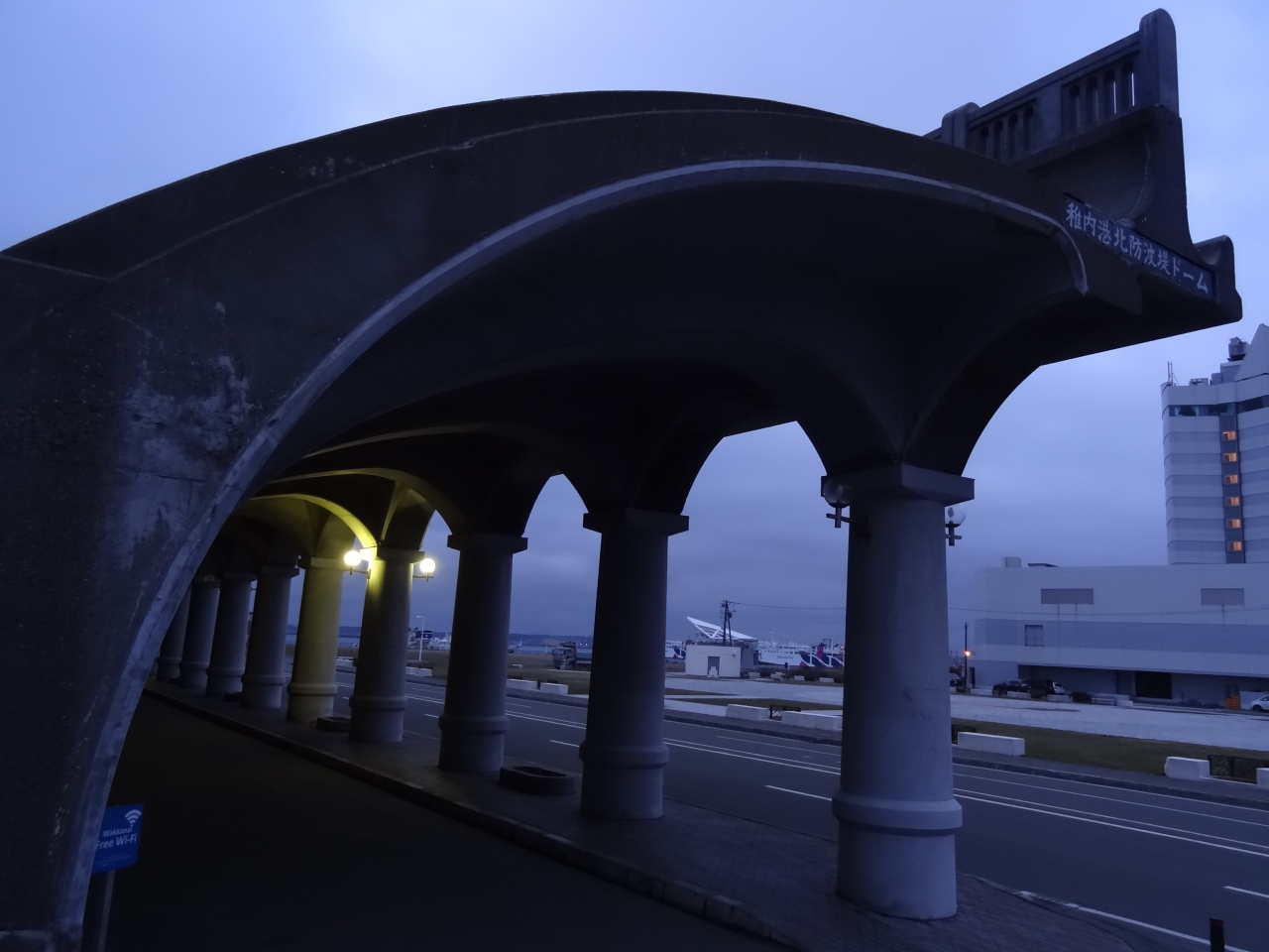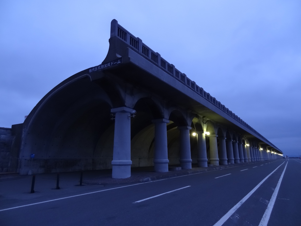 日の出の風景を見るために、ホテルを早く出てこの港の堤防までやって来ました。柱が何かヨーロッパ風だなと思って見ていました。堤防の壁に案内板があり、よく読んでみるとローマ帝国時代風の建築様式でこのドームを造ったとか。道路に沿って柱が50本ほど連なって立っている様は壮観でした。稚内にこのようなユニークな防波堤があると夢にも思わなかったです。