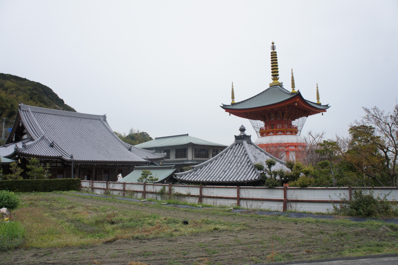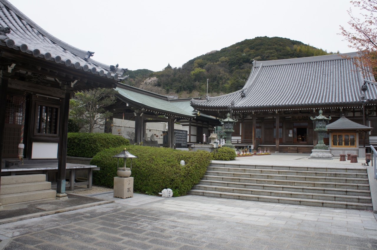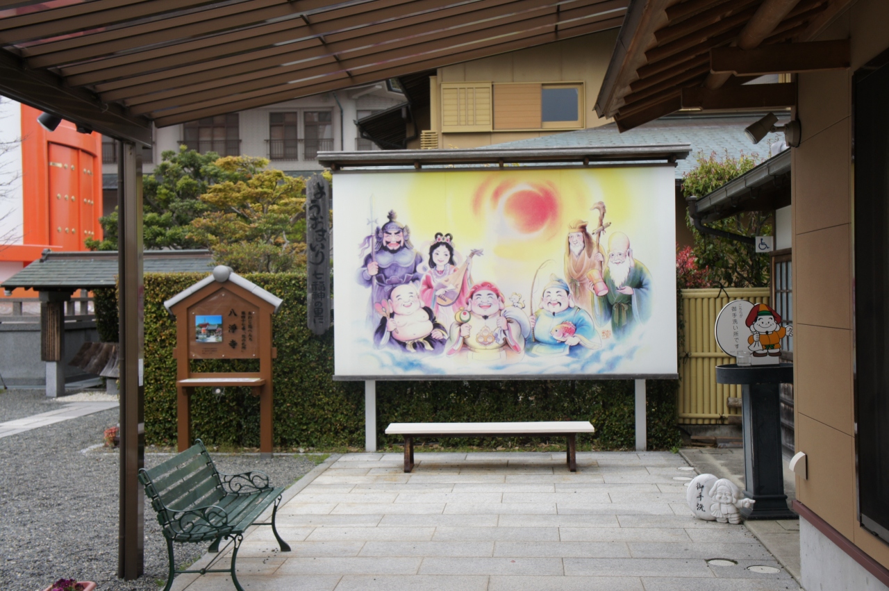 淡路島に入って洲本市に向かう途中、路上でこのお寺の看板に目が留まり訪れました。周りは野原や田畑で囲まれていてひっそりとしていました。山門から入ると、アニメっぽい七福神が描かれた看板が目に入ります。左側に進むと、朱色の七福宝塔が見えてきて、手前にある八重桜を入れて撮影。福取水にはミニサイズの七福神がズラリ並んでいました。その横には白くて大きな観音様が立っていました。お堂の引き戸の間からはユーモラスな表情の大黒様がこちらを向いていました。