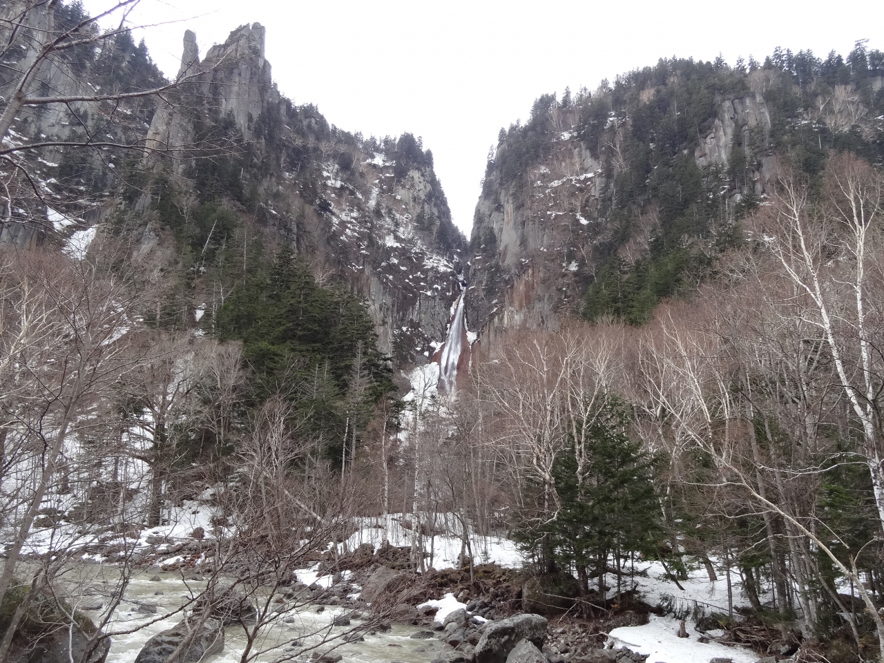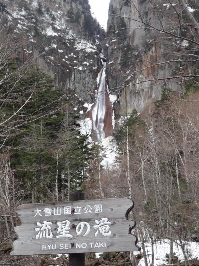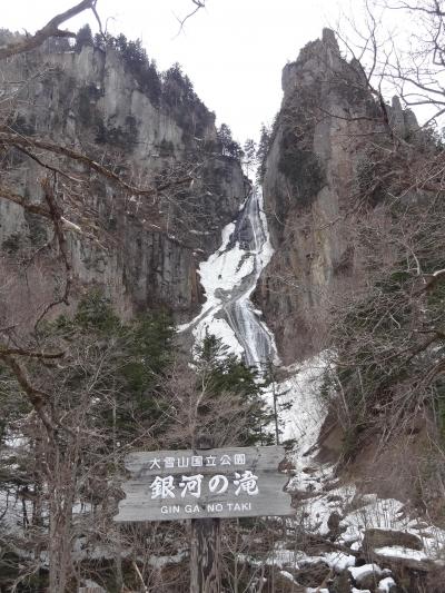 層雲峡のホテルで一泊して翌日の朝、この滝が見える駐車場まで来ました。銀河の滝と書かれた看板が立っていました。この前から写真撮影するのがいいようです。川を挟んで200メートルくらい向こうの山のてっぺんから細い白帯のように流れ落ちていました。白帯のような滝が銀河に見えるからこういう名前が付いたのだと理解できました。滝壺まで行きたかったのですが、どうもそこまでは行けそうもなかったです。