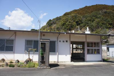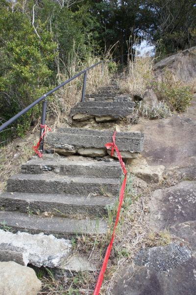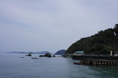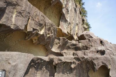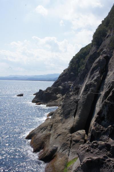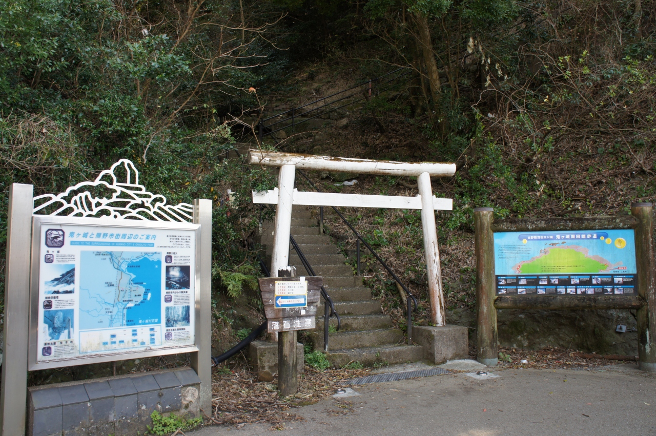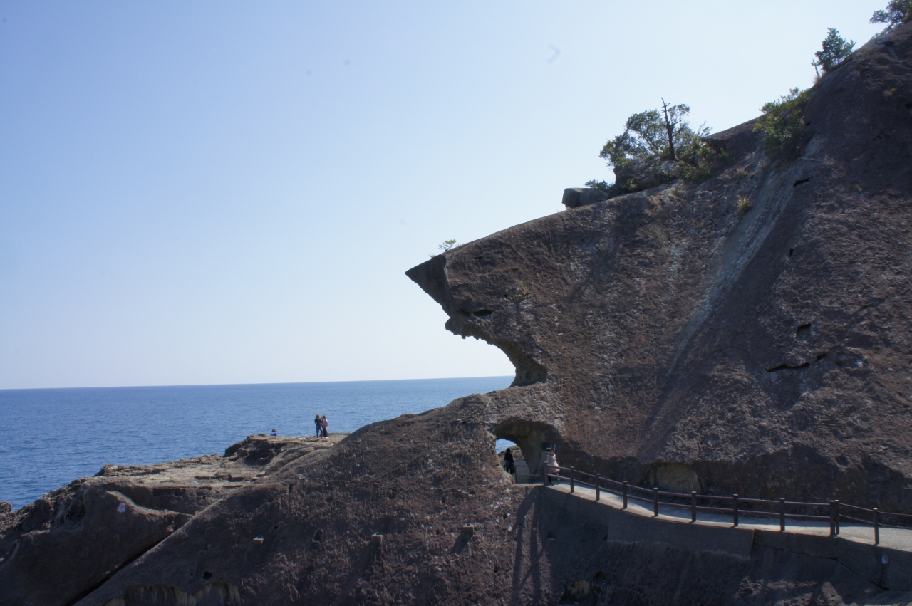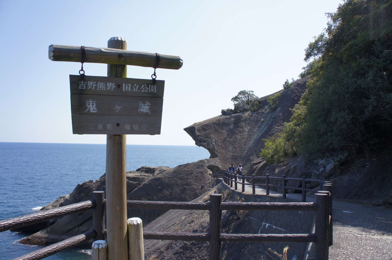 青春18きっぷを利用して鬼ヶ城へ行きました。JR大泊駅で下車、徒歩20分で鬼ヶ城に着けます。駐車場の広場には水産物直売所があり、ここで人気のさんま姿寿司を買い遊歩道の手前で昼食タイム。遊歩道の入り口には「トトロ」風のオブジェが立っています。奥には鬼ヶ城の姿が見えます。名前の通り、鬼が住んでいる城のようです。荒々しい奇岩が続く遊歩道をずっと歩いて進みます。途中、道幅が極端に狭い所もあり、高低差がある険しい遊歩道を歩くにはある程度の度胸が必要です。遊歩道から見る海の景色や、所々にある「鬼の・・・屋」などという岩の造形美には圧倒されます。東口から続く遊歩道は一時間ほど歩いて西口に着けますが、西口はお土産屋や食事処など賑やかなものは何もありません。寂しく鳥居が建っているだけでした。