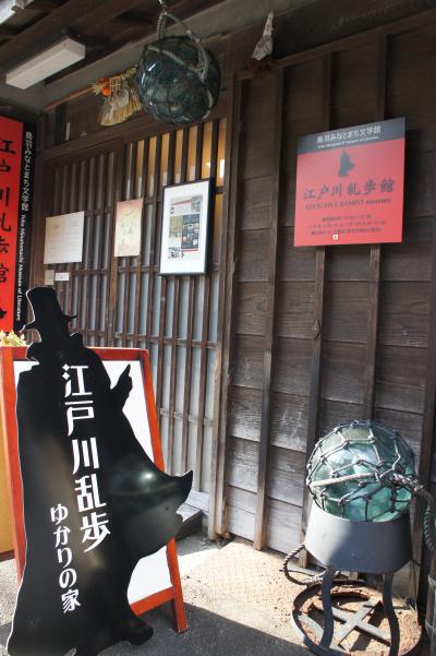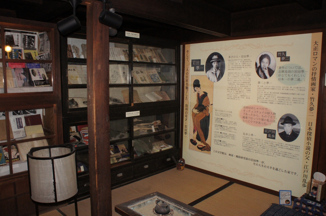 青春18きっぷで鳥羽市へ観光でやってきました。JR鳥羽駅から徒歩で10分ほどでこの乱歩館に着けます。建物の正面にはベンチがあり黒猫が座っていて、怪しげな雰囲気があります。入館すると天井には裸電球が灯り、レトロ感が漂っています。当時の生活用具や乱歩宛にきた郵便物などが展示されています。展示室はここだけでなく、さらに奥には白壁の土蔵や平屋の建物などが続きます。それらの入り口に入ると、どこからともなく怪しげな声や音が聞こえてきます。乱歩の作品に触れた方なら作品の中に紛れ込んだような雰囲気に圧倒されます。外の通路には映画「潮騒」の大看板や紙芝居の自転車などが無造作に置かれています。別の建物では、乱歩が生まれた頃の鳥羽の貴重な映像フィルムも上映されています。入館料以上の価値があり一時間以上はゆっくり見学できますので、鳥羽市観光には必ず入れたい観光スポットと言えるでしょう。