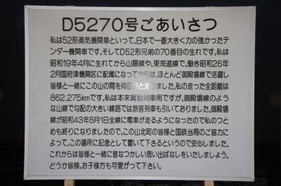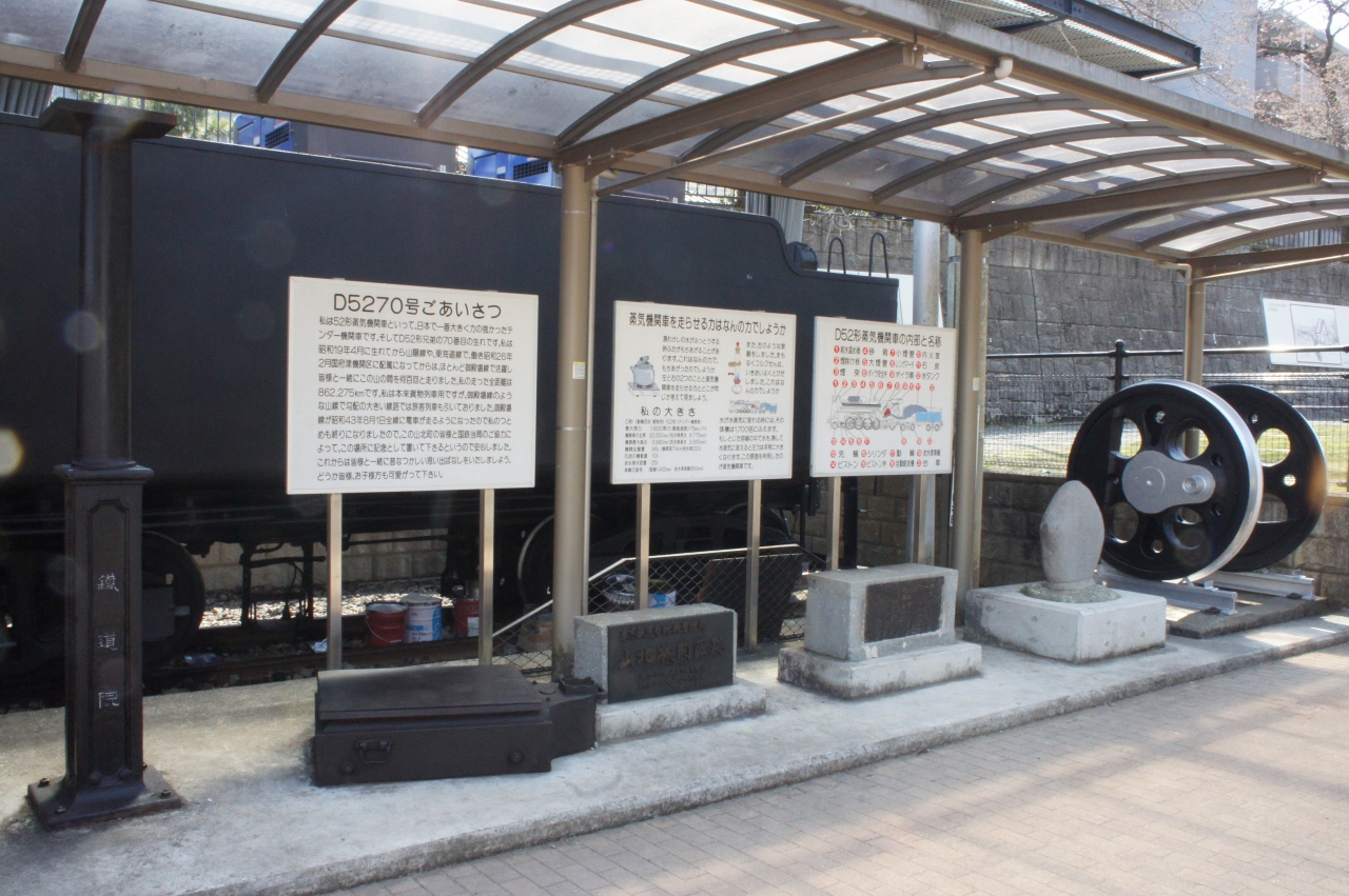 青春18きっぷで御殿場線周遊のため、この山北駅で途中下車してD52を見に行きました。公園の広場は桜まつりが行われていて、たくさんの露店が並び、地元の人や観光客で賑わっていました。桜はまだ二分咲きで、これから5日後くらいが本番といった感じでした。広場の脇にD52機関車が屋外展示されていて、案内板にはD52機関車を詳しく説明されていて、機関車に詳しくない人でも十分楽しめるように展示に工夫がされていました。大きな車輪が機関車の横にもあり大きな車輪に見入ってしまいました。