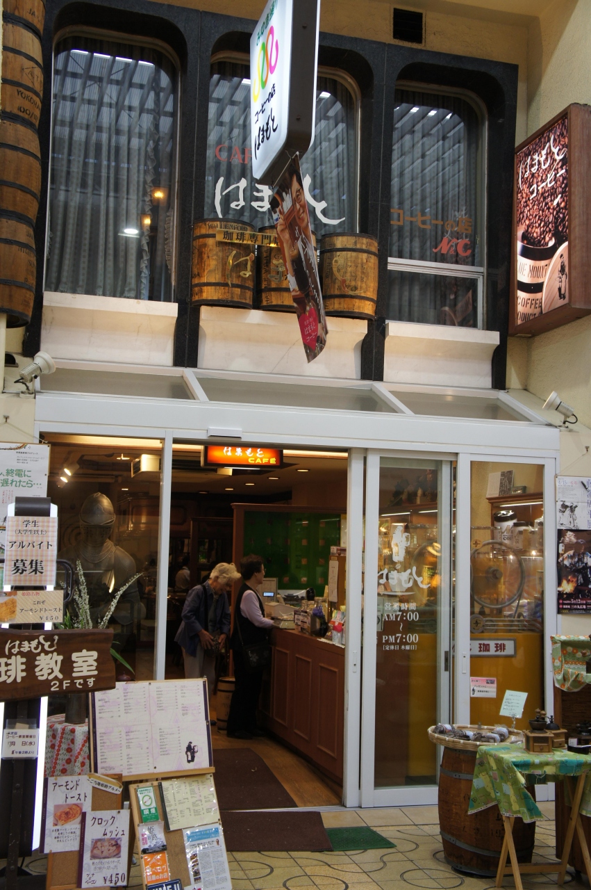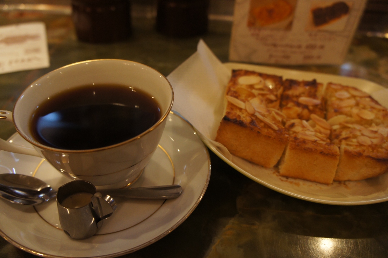 大好きなコーヒーを飲みながら、ちょっと休憩をしたいと思ってアーケード街を歩いていたら、偶然にもこの喫茶店を見つけました。店の前の頭上にはコーヒー樽が二個吊してあり、入り口の横には目を引く看板が立っていました。入店すると話し好きなおばちゃんがいて、つい旅の話ではずんでしまいました。勧められるまま、奥のカウンターに着席。目の前で数本のサイフォンがあり、男女のスタッフが忙しそうに厨房の中で動き回っていました。トーストとコーヒーのメニューが人気らしくて、それを注文してみました。アーモンドバターのトーストはアーモンドの香りとトーストの食感が見事にマッチしていて、コーヒーは香りとコクが最高でした。姫路城などの観光の後で、このお店を利用することをお勧めします。