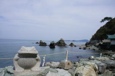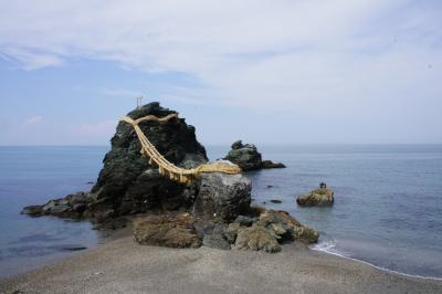 鳥羽市観光のついでに、18きっぷを利用してJR二見浦駅下車、徒歩15分で夫婦岩を間近に見ることができます。海の方に突き出した展望台があり、ここからも夫婦岩を遠くに見られます。記念写真を撮るにも人が少ないですから最適な場所だと思います。遊歩道を通って夫婦岩を間近に見られる場所にはなぜか蛙の置物が鎮座しています。この蛙を手前に入れて夫婦岩を撮影すると面白い写真になるでしょう。また、夫婦岩はいろいろ違った角度で撮影するといいでしょう。遊歩道を過ぎたあたりからお土産店や食事処もありますから、景色を堪能しながらゆったりと時間が過ごせます。