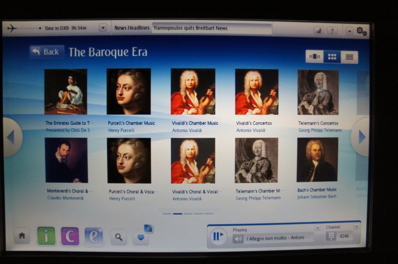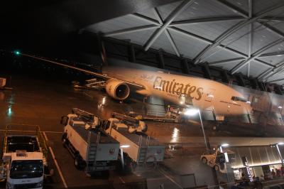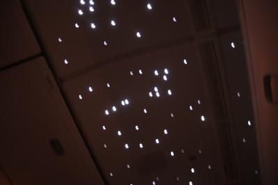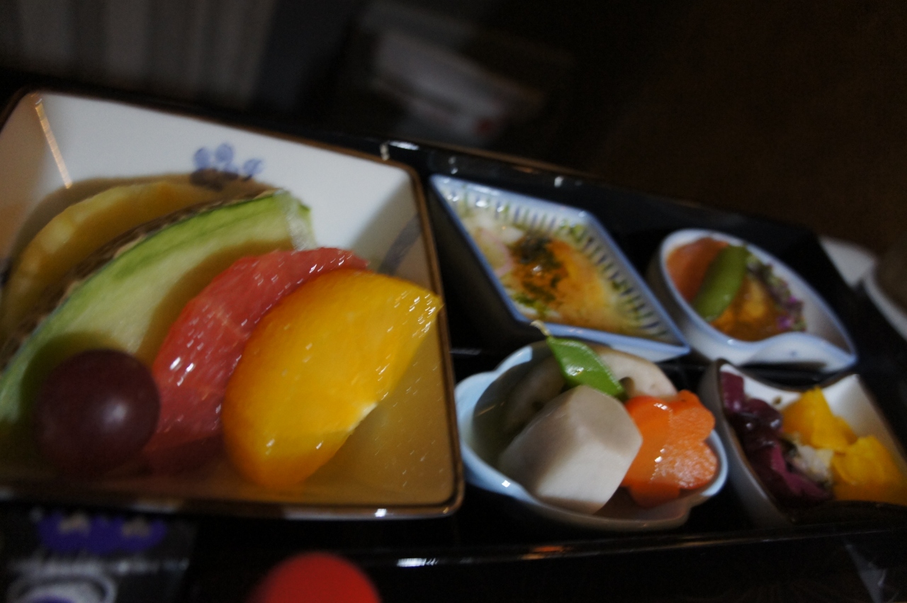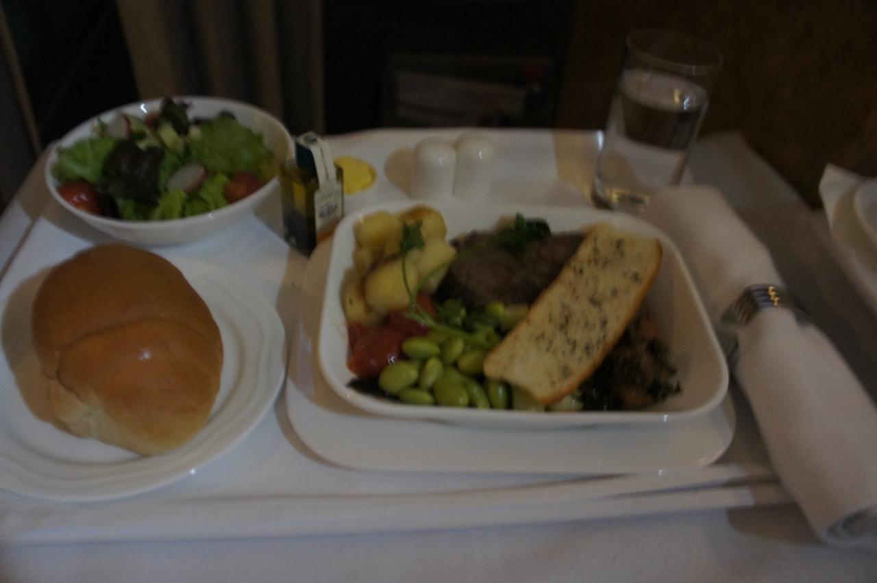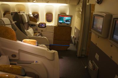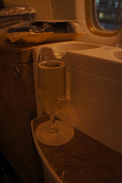 登場して15分後にシャンパンサービスがあります。その後、ブルガリのアメニティポーチがもらえます。ポーチは男性用と女性用の二種類です。家内がもらった女性用ポーチは男性用よりデザインがよかったです。食事とワインの品書きがいただけます。食事は何がいいか早く選ばなければなりません。ワインなどは食事が出されるまでに決めればいいです。搭乗して、一時間半後には選んだ夕食が出されます。ビジネスのさくらラウンジでおなかいっぱい食べてしまったので軽い食事にしましたが食べきれませんでした。30分後にウイスキーをオンザロックで注文しました。おつまみとしてナッツももらえました。リクライニングは左手元の3つのスイッチで操作するのですが、3回ぐらい操作しないと思うように調節ができませんでした。19インチのモニターで映画や音楽が楽しめます。私はクラシックのモーツァルトやヴィヴァルディを聴きました。機内が暗くなると、天井部分が星空のように見えてロマンチックな感じがしました。午前4時過ぎに朝食が出されました。味は日本人好みに味付けされていてとても美味しくいただけました。フルーツも新鮮、アイスクリームも美味しくいただけました。乗り継ぎのドバイに到着したのが午前5時45分でした。時差ー5時間ですから、時計を必ずドバイ時間に合わせる必要があります。