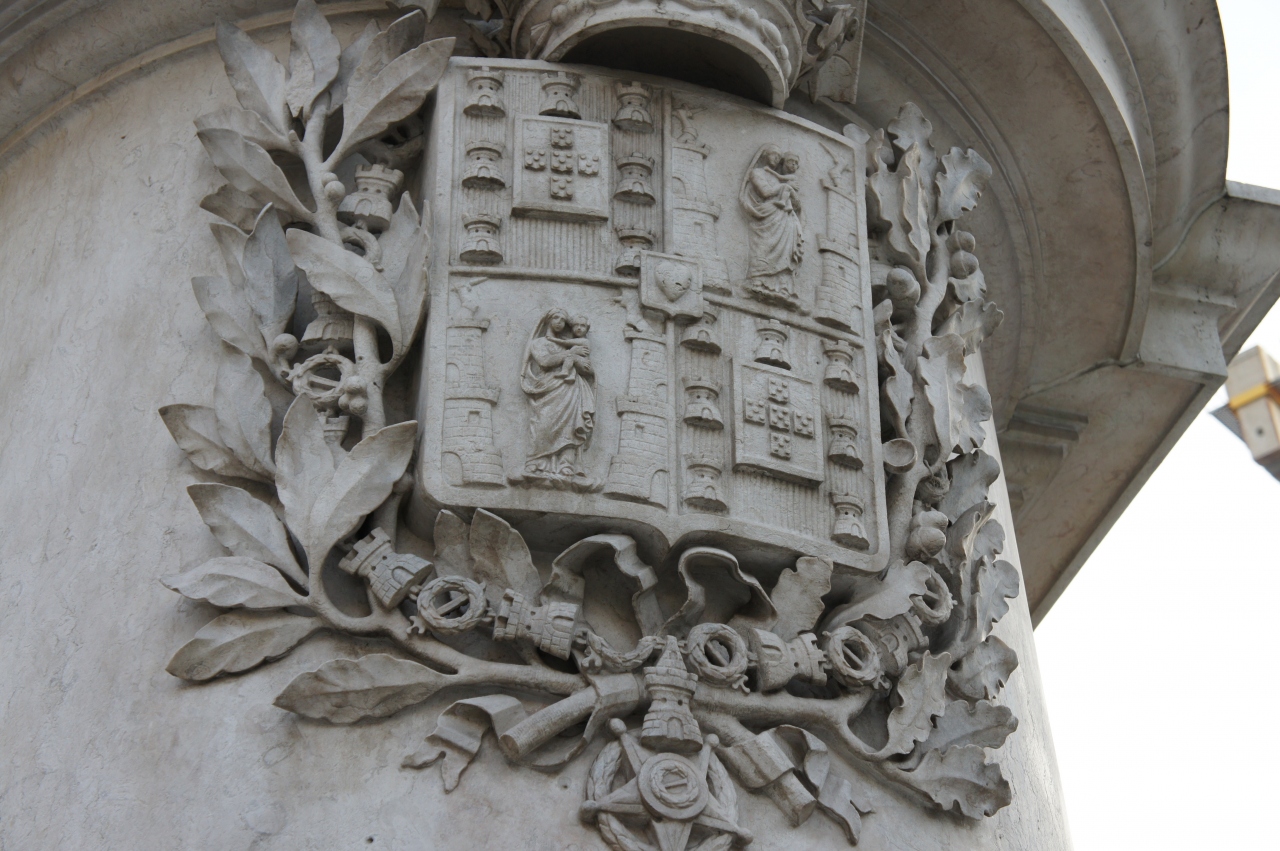 集合場所としてこのロシオ広場に立つ「ドン・ペドロ4世像」を選びました。待ち合わせ場所としても最適らしくて、地元の人も結構見えました。ドン・ペドロ4世は別名「戦争王」とか「ブラジル皇帝、ペドロ一世」とも呼ばれています。台座の部分には素晴らしいレリーフが表裏にあり、ペドロ4世の名の刻印もされています。広場の周りに立つ建物は銀行やオフィス・レストランなどで、造りがかなり古く見えます。ある建物の屋上には広場を見下ろすように二体の彫像が立っています。
