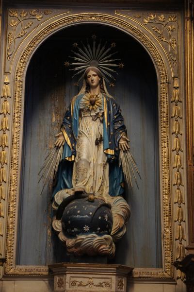 絵画を見るような景色です。教会の壁には柱も見えて素晴らしい彫刻像で彩られています。歩道側からも教会前の三角スペースの広場からもよく見えます。教会の中に入ると、マリア様のような女性像が何体も立っています。その中に縁結びの神様が祀られているとのことですが、どれがその像なのかよくわかりませんでした。でも、歴史があるこの教会に入ると心が洗われるような気持ちになれます。- 旅行時期