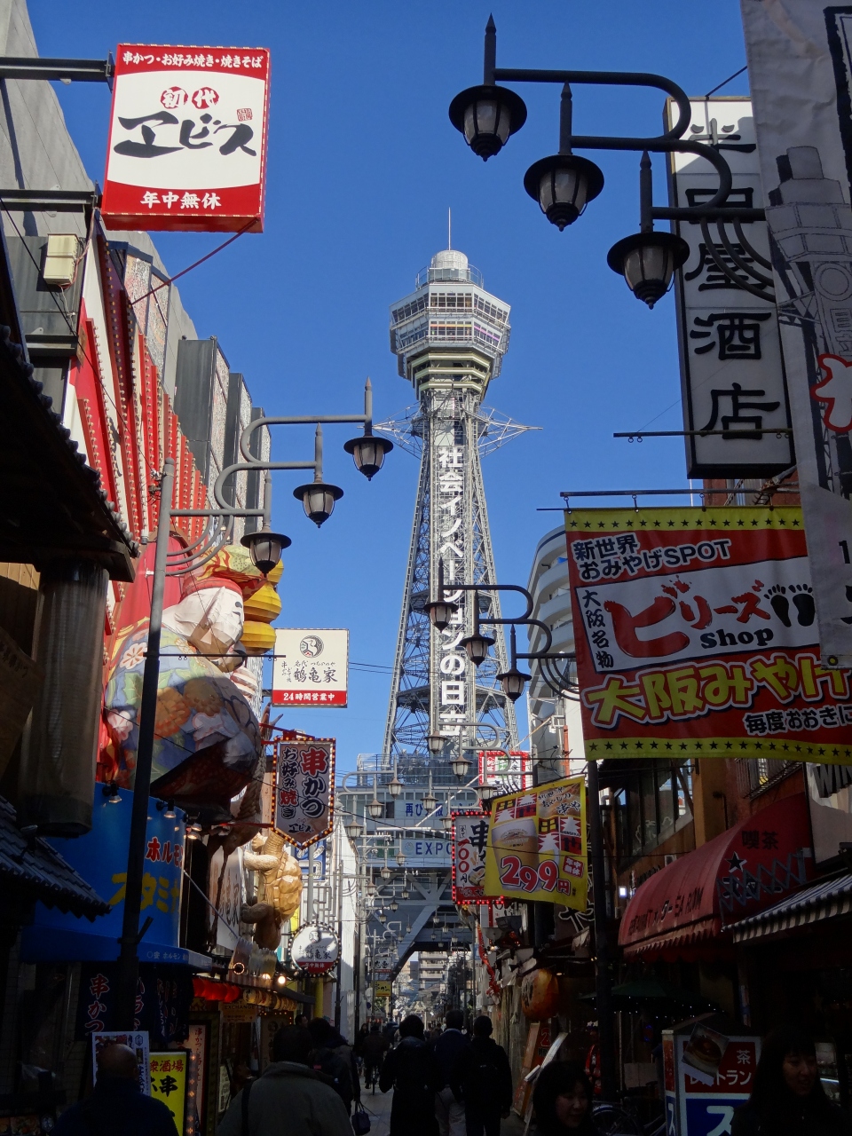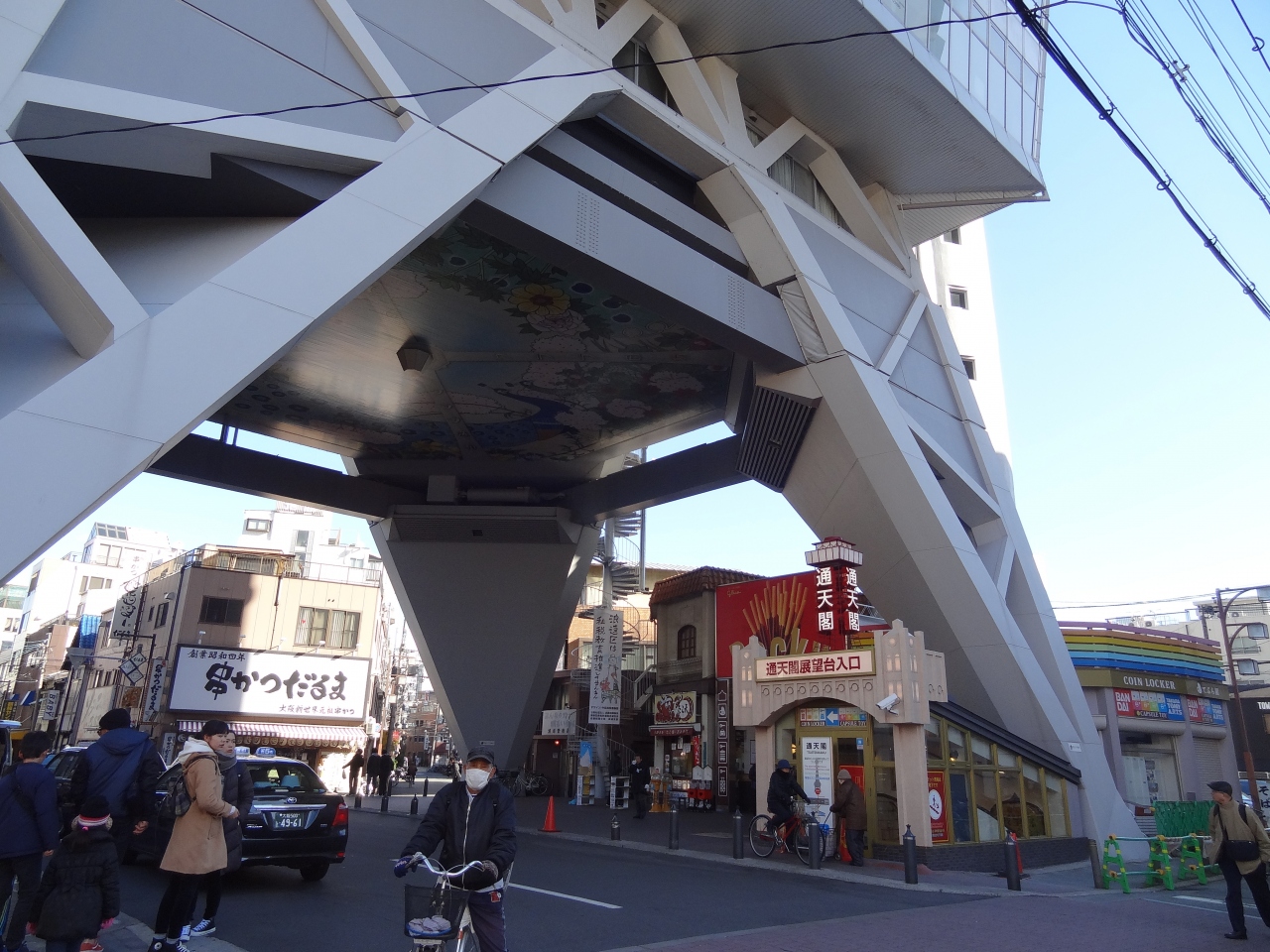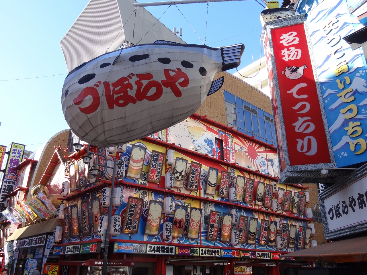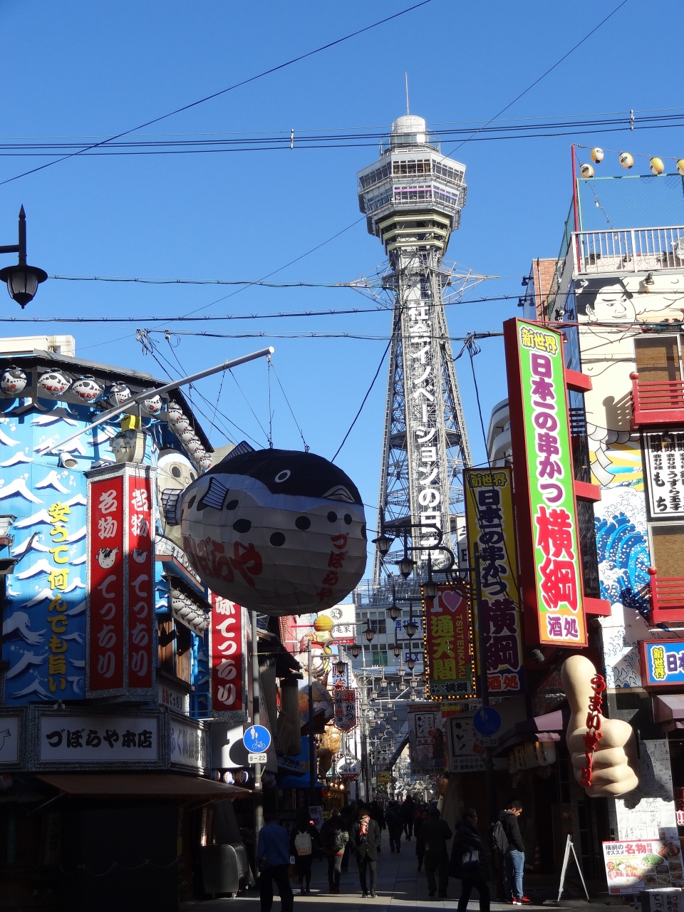 JR天王寺駅から徒歩10分で通天閣へ行けます。途中、動物園の前を通過。でも、休園日で残念。通天閣周辺には道頓堀のようなド派手な看板が目立つお店が並んでいます。やはり、圧巻なのは通天閣をバックにしたフグの張りぼて。巨大な提灯のようなフグが青空を泳いでいます。大きなカラフルな看板が立つ奥に通天閣が見える景色は、本当に最高!「なにわのエッフェル塔」そだねー!
