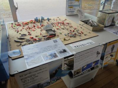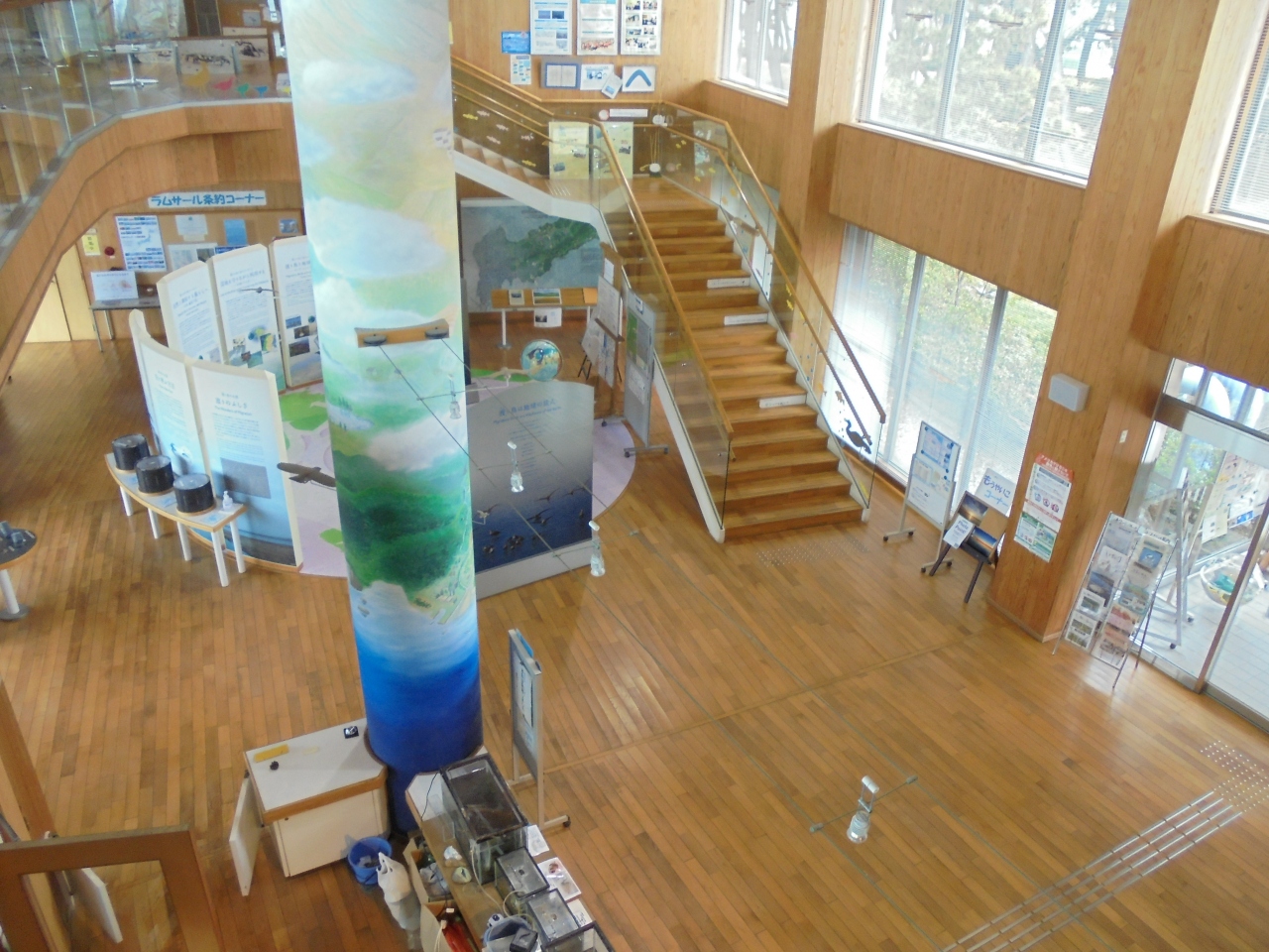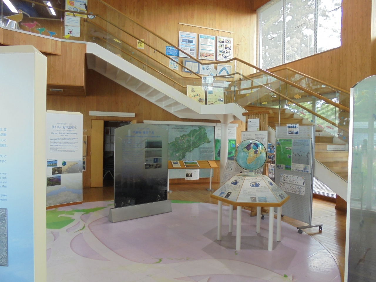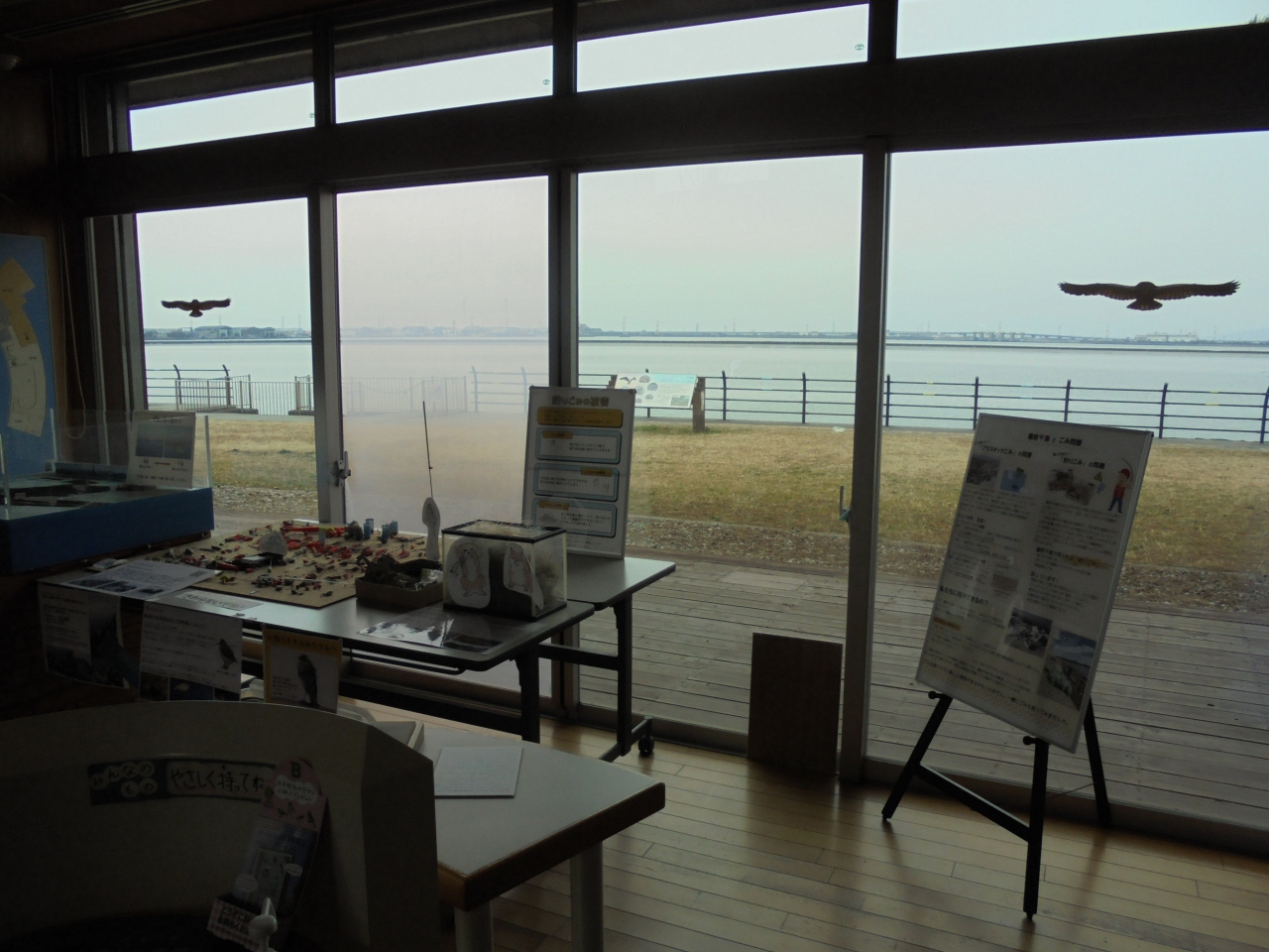 入館料は無料で写真撮影も可能です。館内には干潟や野鳥に関する工夫された展示がされています。特に、ラムサール条約やヤドカリなどの展示はわかりやすいです。二階にも展示物があって、ヨシで作られた舟の模型も展示されています。二階から続くバルコニーから眼前に広がる干潟を眺めることも。双眼鏡を持参していると、カモなどの野鳥を詳しく観察できます。