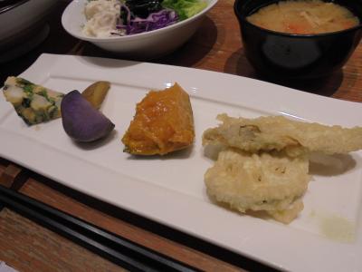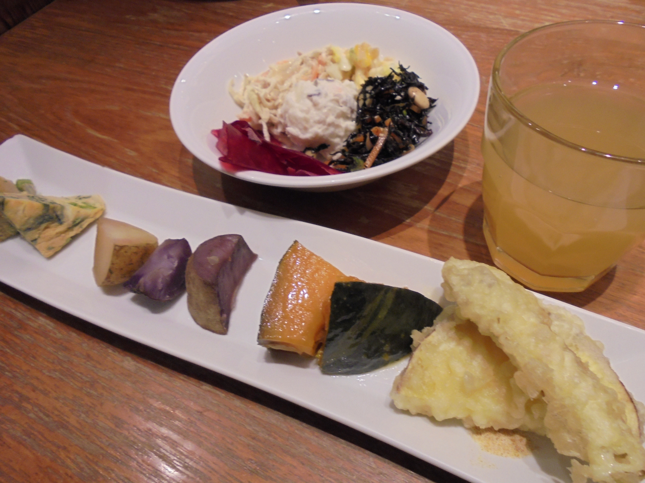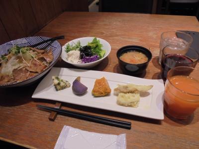 JRゲートタワー名古屋13階にあるお店です。店内は和モダンな内装で、落ち着いた雰囲気です。メイン料理を決めると、野菜・惣菜が90分で食べ放題になります。ドリンクバーもあります。生野菜や天ぷらなどを含む惣菜の種類が多くあります。サラダ用のボウルや総菜用の長皿はすべて白い陶器製。清潔感があります。珍しいドレッシング3種や調味料(塩)が揃っている。豚肉の生姜焼きが丁寧に調理されていて、豚肉の旨みが凝縮されて美味しい。野菜・惣菜・ドリンクの食べ飲み放題で2千円少し。コスパがいいです。
