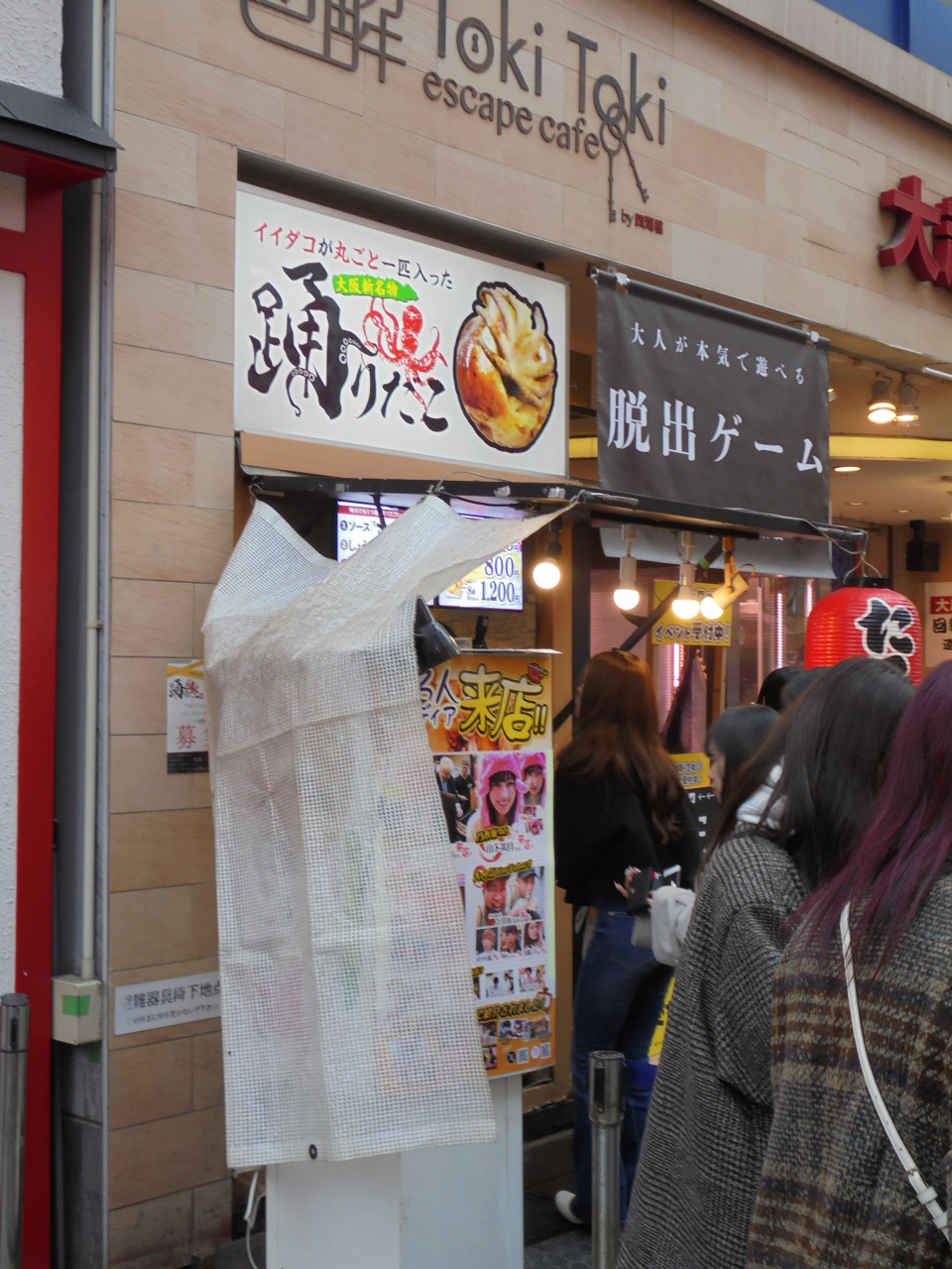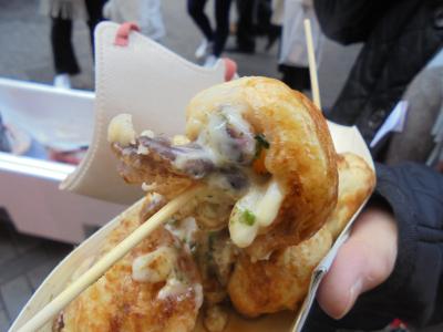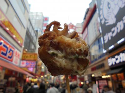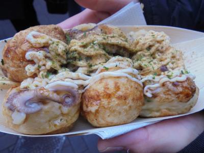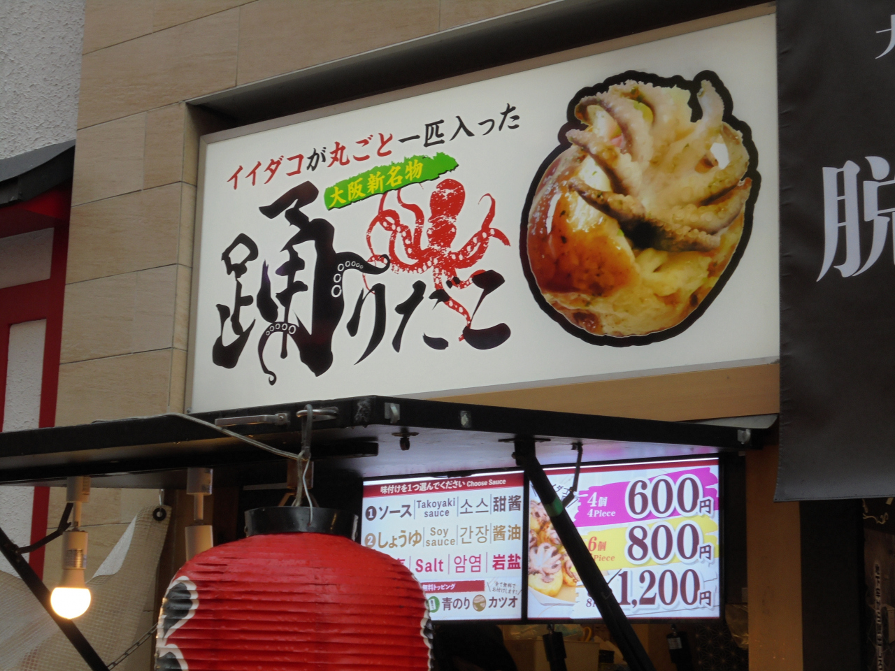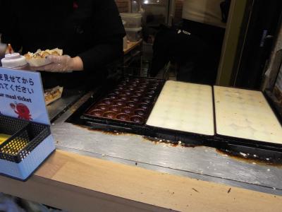 道頓堀にある人気のたこやき店。お店の前には10人ほどお客さんが並ぶ。回転が早いので、最後尾でも3分くらいで券売機前に。6コで800円のイイダコ入りタコ焼きを券売機で購入。醤油味のタコ焼きできたてを立ち食い。イイダコが丸ごと入ったタコ焼きはアツアツ。フーフーして食べると、イイダコの旨味が口いっぱいに広がります。結構食べ応えがあります。美味しすぎてもっと食べたかったけど、夕食も近いので二人で一皿だけにしておきました。