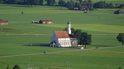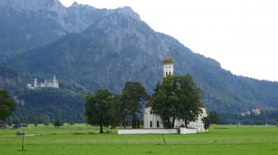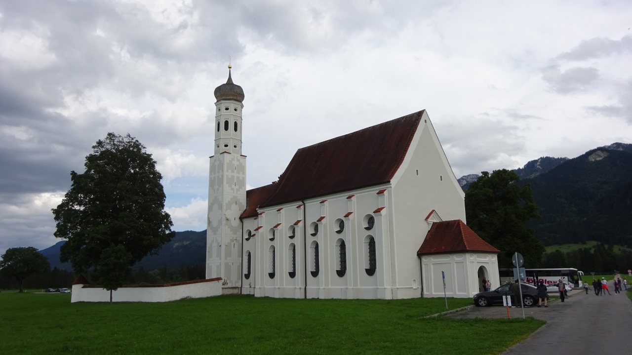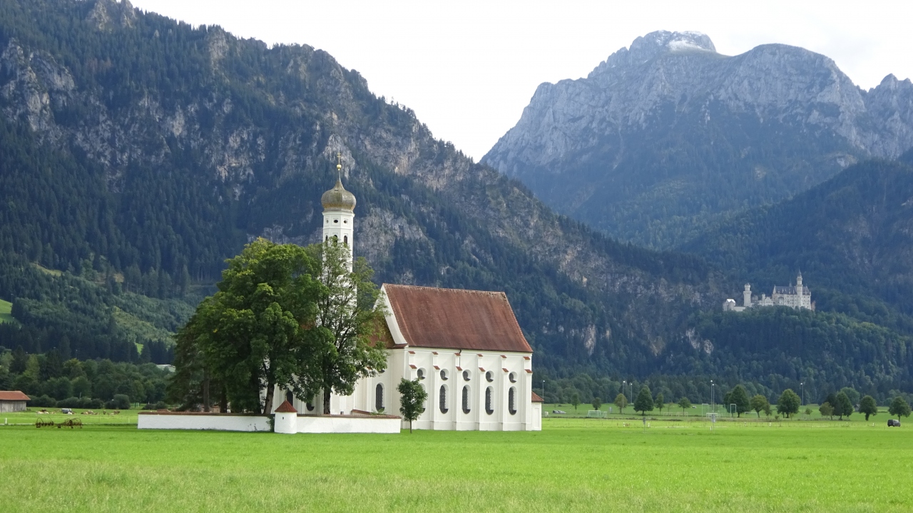 シュヴァンガウのSchwangau Rathausのバス停からミュンヘナー通りを東に進むと右手に草原の中を聖コロマン教会に向かって真っすぐに伸びる道があります。バス停から教会までは約1kmです。小さいながらも綺麗にまとまった教会です。訪問当時は教会の開いている時間帯は14:00~16:30でした。教会の内部そのものよりも、ミュンヘナー通りからノイシュヴァンシュタイン城を背景にした教会の風景がとても良かったです。