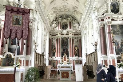 教会は1180年の創建で、1781-83年にロココ様式を取り入れて改修されました。内部はグリーンの模様がはいった白い柱と壁で統一されており、清楚な感じがします。内陣には祭壇らしきものはありません。