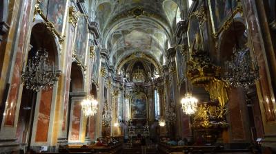 天井、柱、内陣、拝廊すべてバロックぎゅうぎゅう詰めの装飾。さらに身廊の両側の壁には絵画がずらり。天井のフレスコ画もすごい。