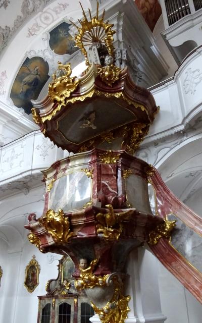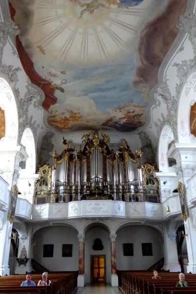 教会内は、白い漆喰とカラフルなフレスコ画など、豪華なバロック様式の装飾でいっぱいです。この教会の起源は810年のようですが、1728年のリンダウの大火事で焼失、1748-52年に今のバロック様式に再建されました。拝廊の上にあるロココ調のパイプオルガンはすごく横幅があって印象的でした。- 旅行時期