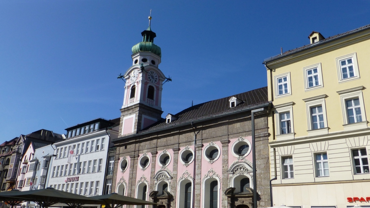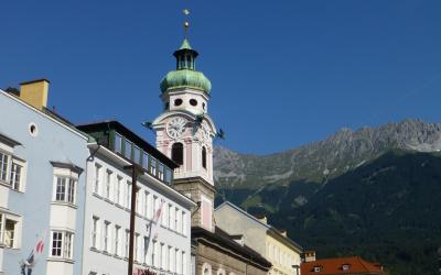 後ろにノルトケッテ連峰をひかえ、教会のピンク色の鐘楼が映えます。インスブルックの見事な景観に貢献している教会です。