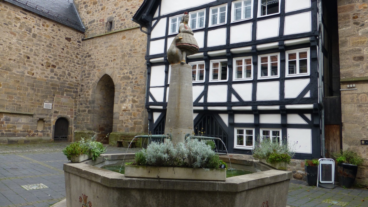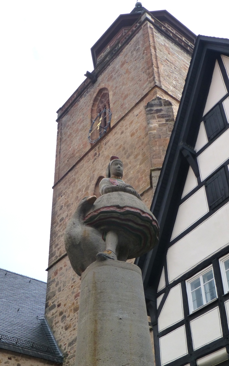 マルクト広場に面したワインハウスのちょうど裏にある泉です。ヴァルプルギス教会裏のキルヒ広場の西に位置します。シュヴァルムの泉の中央に「ガチョウ番の娘」の像があります(1958年作)。シュヴァルム地方の民族衣装をつけた素朴な女の子の像ですが、童話の「赤ずきんちゃん」ではありません。ゲッティンゲンの「ガチョウ娘リーゼル」像よりずっと原作の童話に合っている感じがしました。
