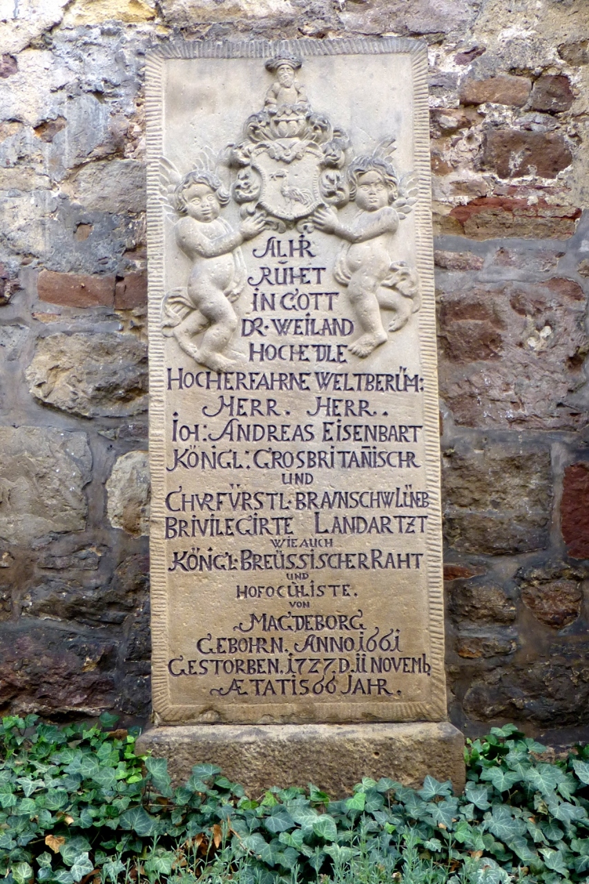教会の北側外壁に鉄ひげ博士アイゼンバルトの墓碑があります。あちこち診察の旅をしていた彼は1727年この町で亡くなりました。