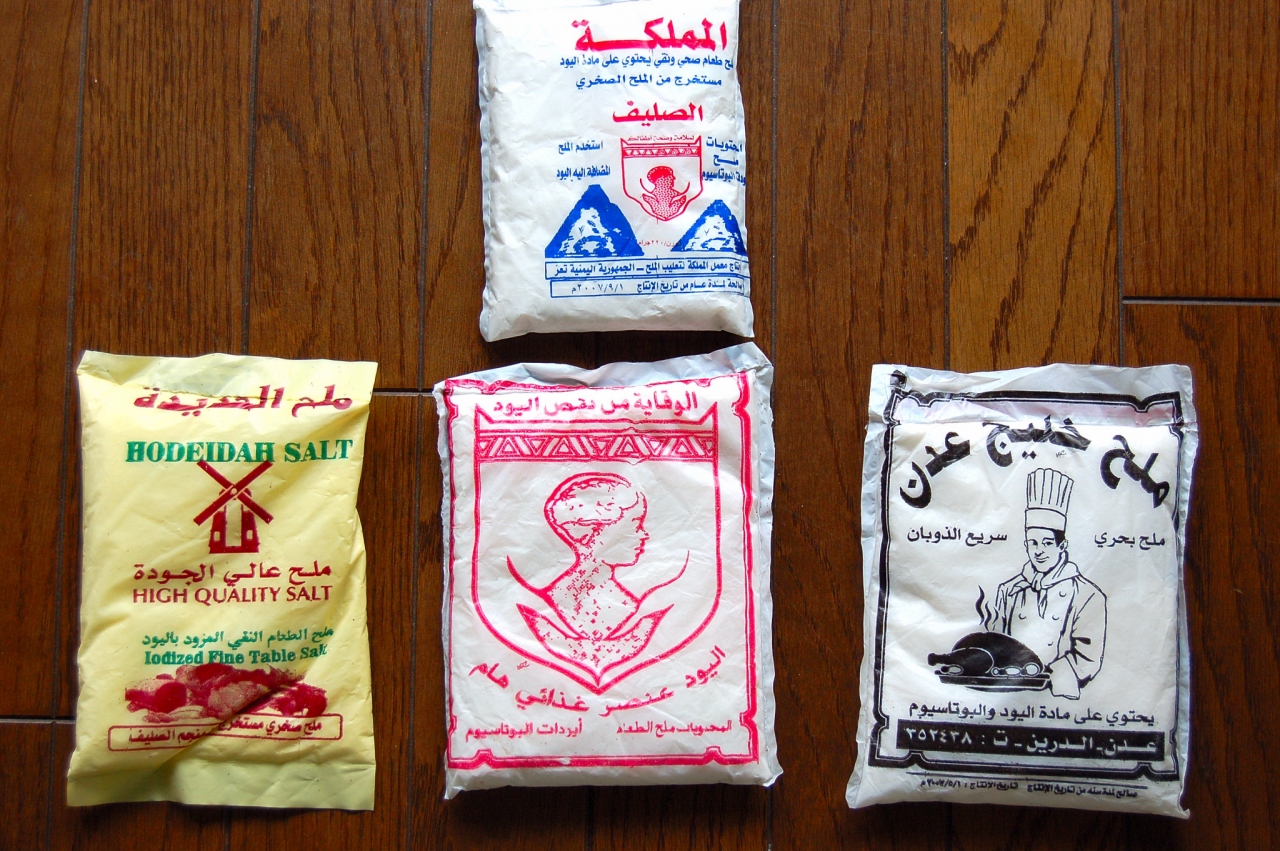 イエメンでパック入りの塩を沢山買って来ました。お土産代わりに皆さんに差し上げました。一袋220~320g、重さもデザインも色々ですが、値段は都市部ではどこでも15リアル、一部田舎では20リアルでした。まとめて買えば多少の値引きは容易でした。