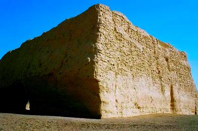 敦煌から西へ80~100km、前漢時代の遺跡のひとつ玉門関は、縦横26~29m、高さ9m位、各面に大きな穴があいていますが、変化とアクセントにかけるのっぺりした方形の構築物です。