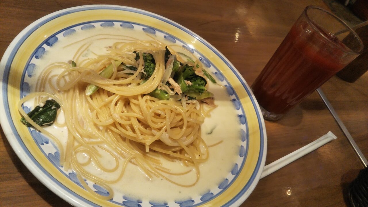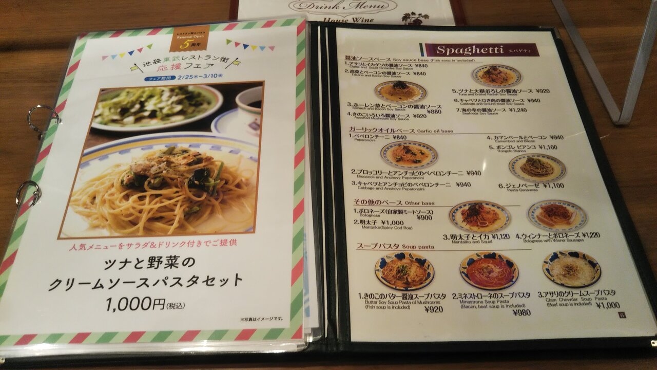 レストラン街スパイスのリニューアルオープンから5周年記念で期間限定でパスタにサラダ、ドリンクがついて1,000円のメニューが出ていました。