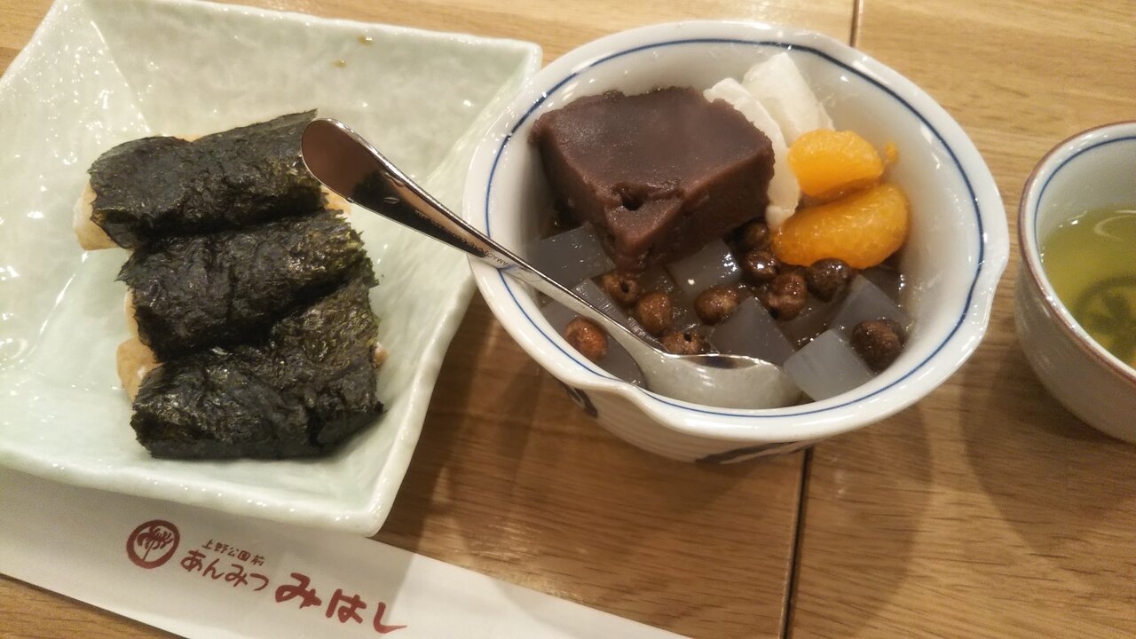 くどすぎない餡子とたまに入っている求肥、寒天、みかんと疲れた身体に染みるのですよ。
