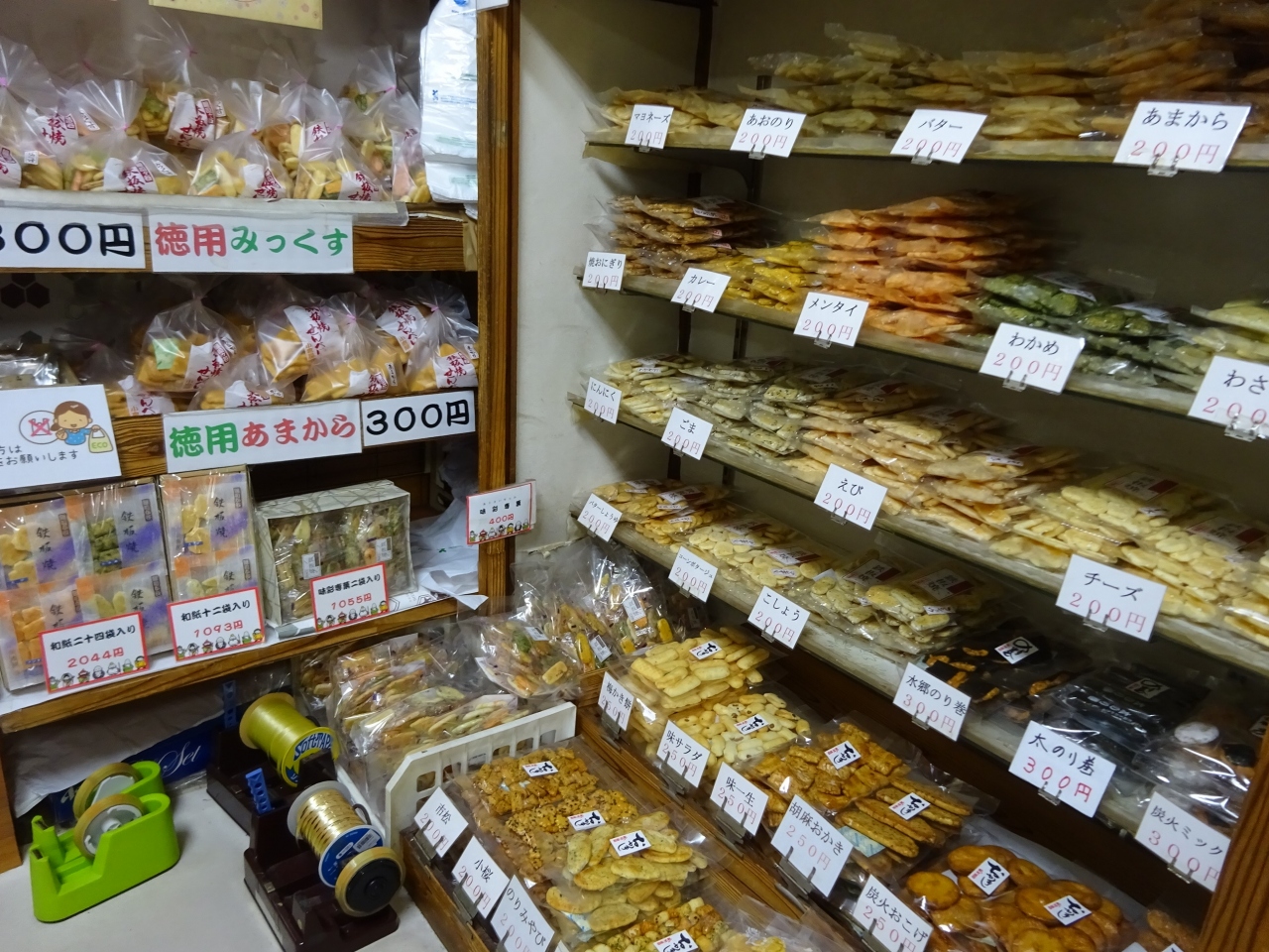 昭和の香りの店内は庶民の味方のお煎餅が一杯、看板商品のあまからはハッピーターンを更に濃厚にした心地よい甘さと歯触りで、お徳用を購入してもあっという間に食べてしまいます。
