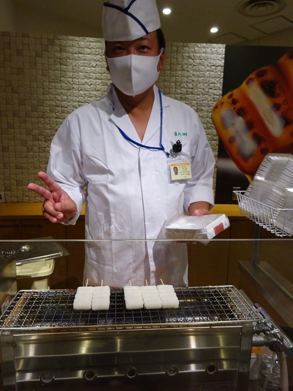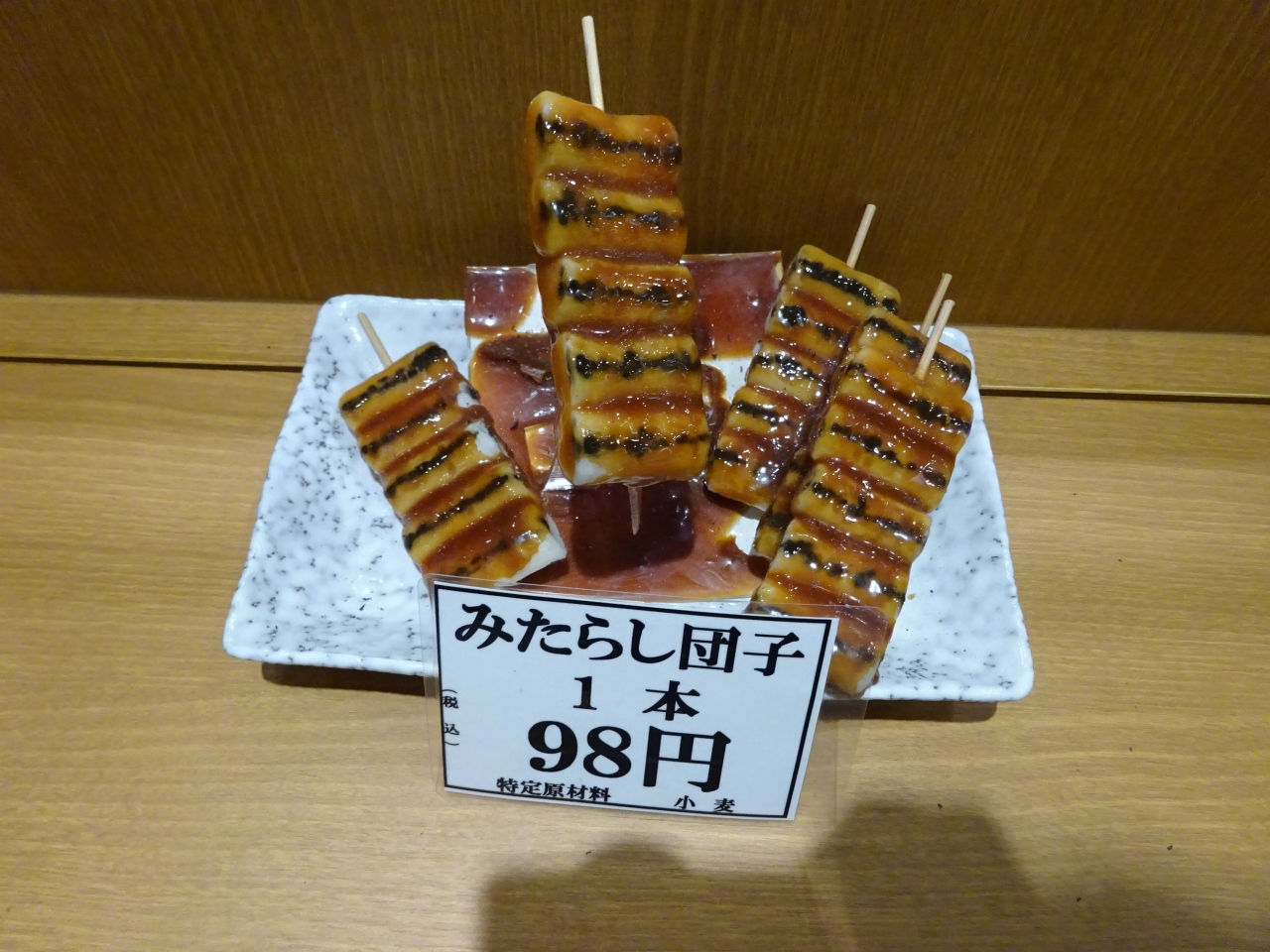 お土産には四角い形のみたらし団子、形がねぎまのようですがもちもちのお団子で、目の前でしっかり焼いてくれます。