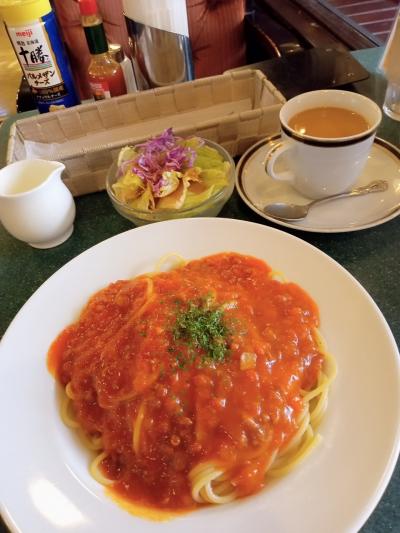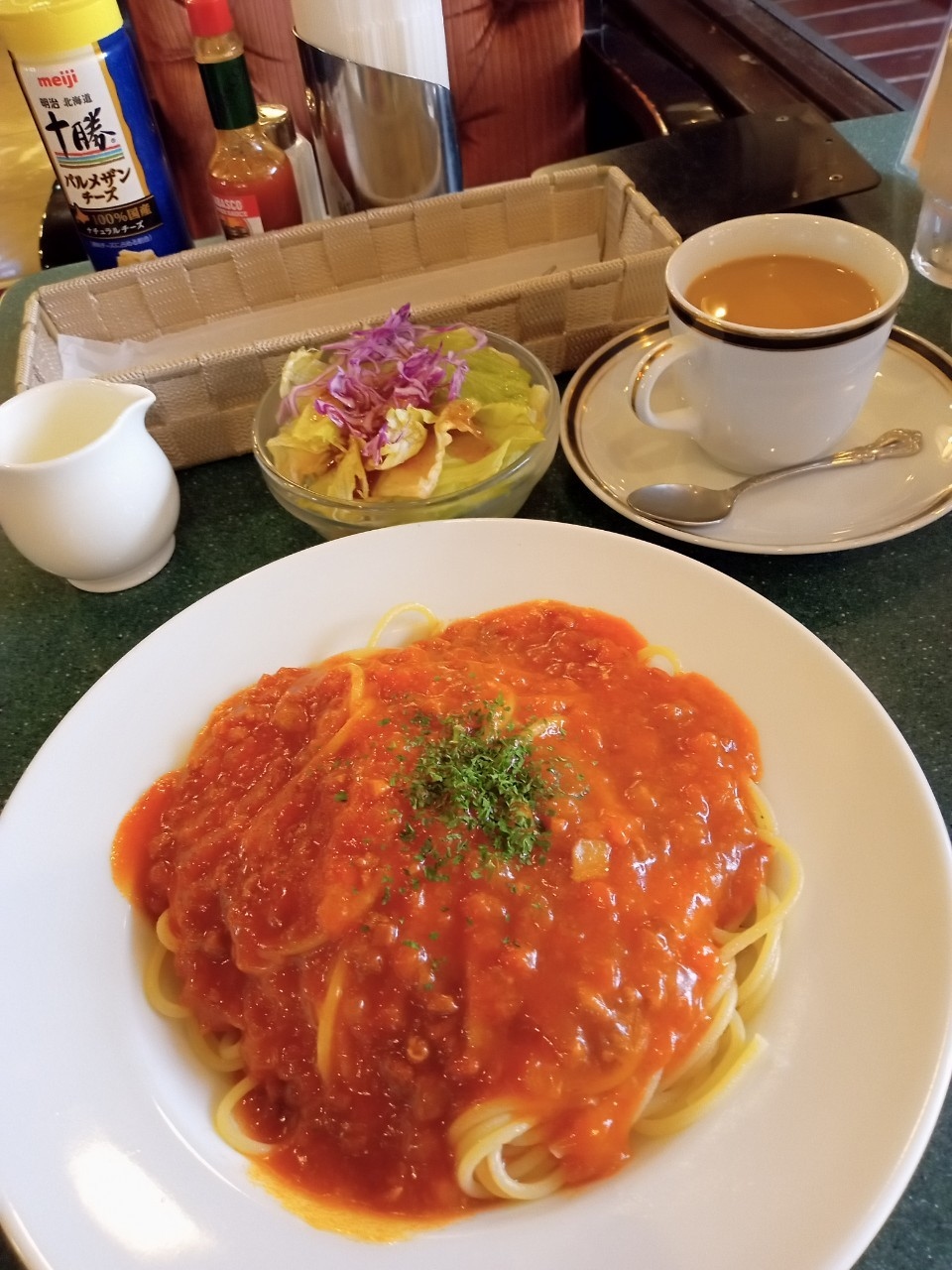 今回はサラダとドリンク付きのミートソースセットを注文。