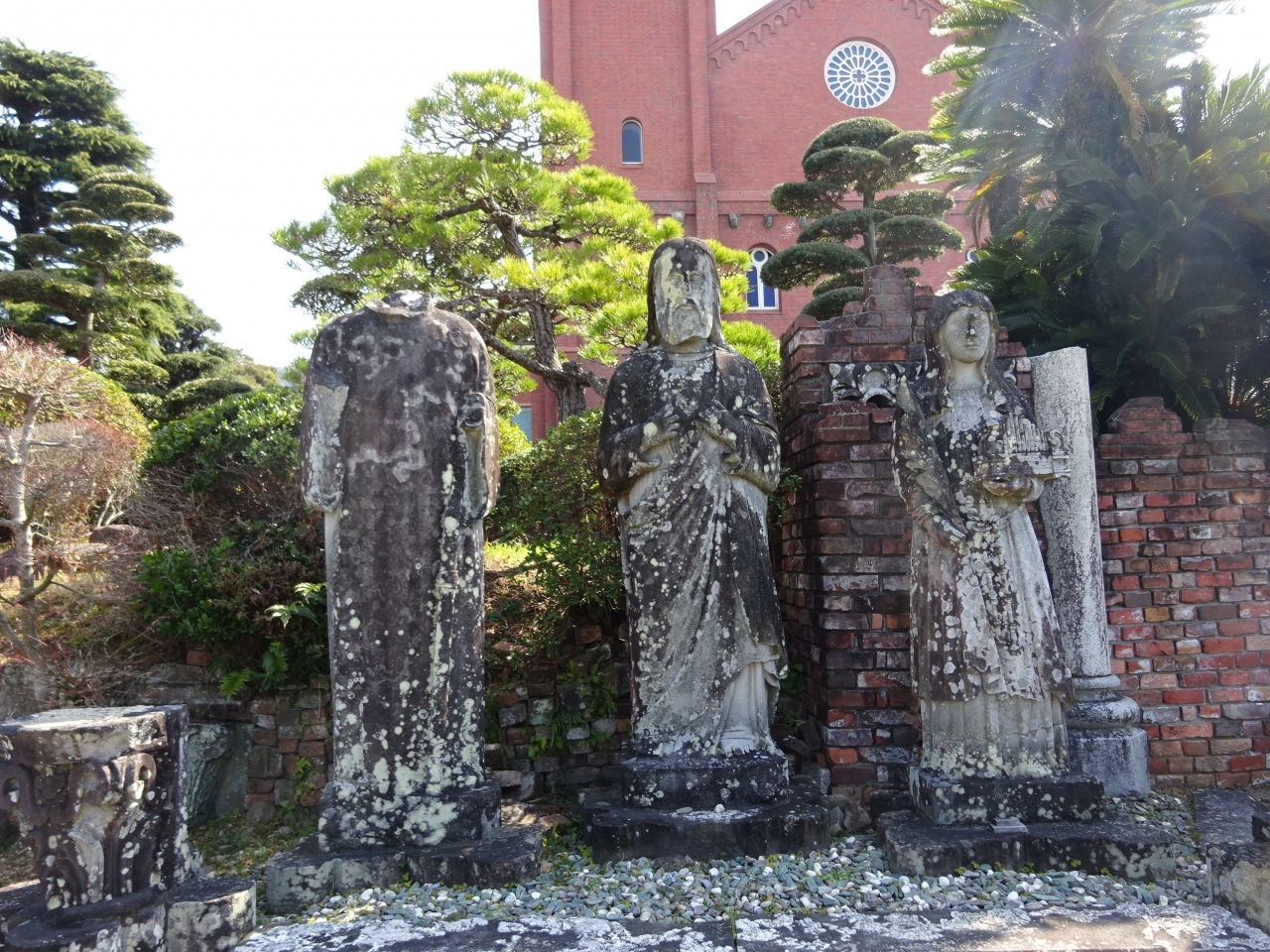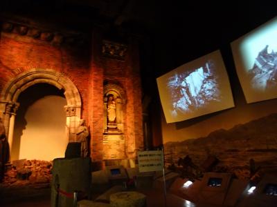 今は美しく重厚な教会に再建されていますが、敷地内には当時の鐘楼に飾ってあった聖人像などが残されていて、悲惨な状況が垣間見れます。