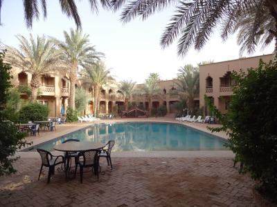 ツアーで利用しました。田舎でこのぐらいの規模で・・・というとここぐらいしかなかったので利用されているホテルに感じました。ロビーと中庭は南仏風でそれなりに素敵です。建物はコテージタイプで2階建て、エレベーターはなし。部屋は砂だらけで、掃除が不十分、バスルームも清潔さに欠けます。食事も美味しくなかったです。どこからか虫も入ってきます。でもサハラ砂漠に行くには、利用価値のあるホテルです。