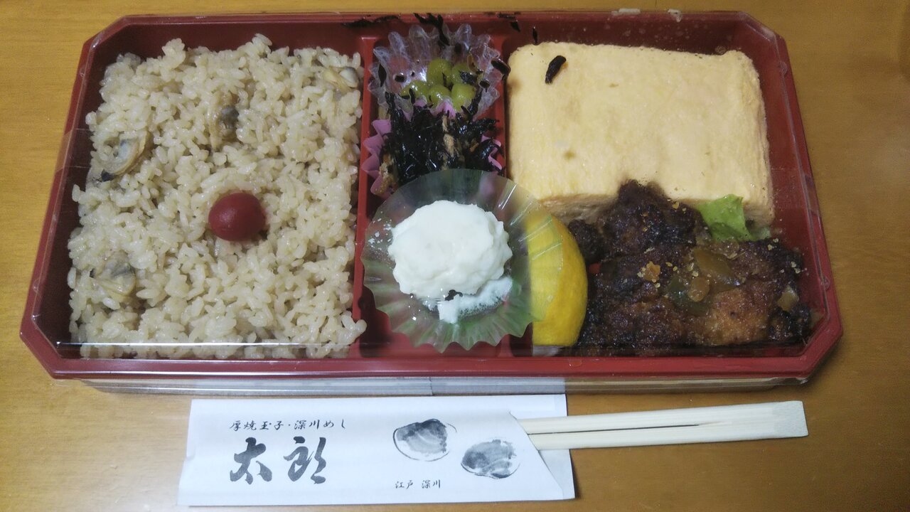 油淋鶏などのおかずと厚焼き玉子が一緒になった深川めしのお弁当は数種類あって時間によってはタイムセールもしています。