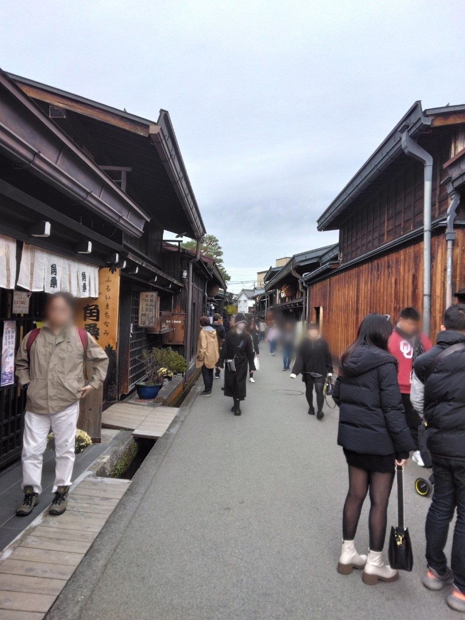 飛騨高山の情緒ある街並み、お土産屋さんや飲食店が並んでいます。