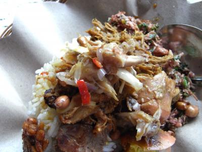 ひっきりなしに地元の人が来る有名ナシチャンプルの店。メニューはありません。大盛りとか特別なオーダーは分かりませんが、普通に注文するとRp10000。味は後から辛さが来るパターン。食べ易くて美味しい。量は多め。飲み物は自分で冷蔵庫から取り出すパターン。料理注文時に飲み物をオーダーしても、自分でやれと言われる。飲み物を含め最後に自己申告でお会計になるので、若干の語学力が必要。是非チャレンジを。