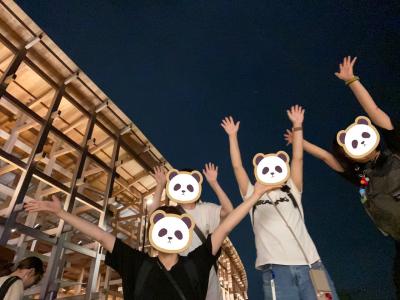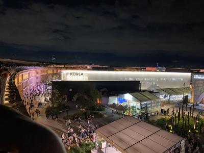大屋根リングから、ライトアップされたパビリオンを見る。とっても綺麗。